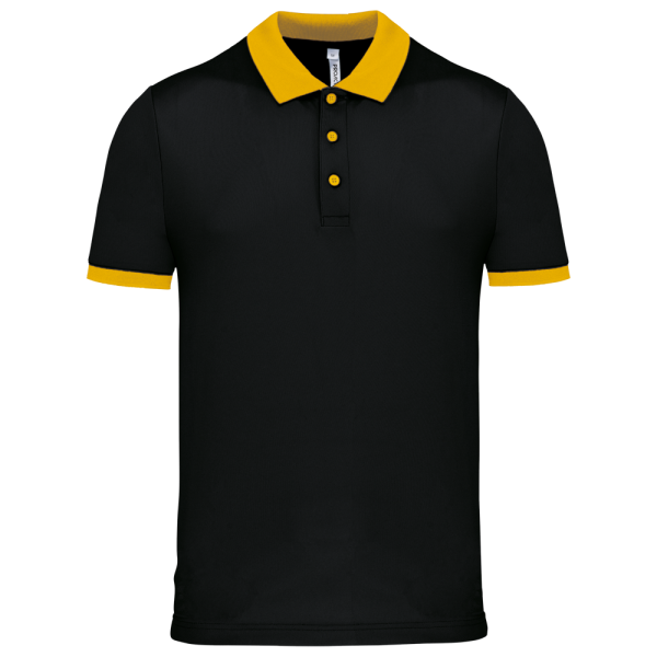 100% piquépolyester Cool Plus®. Rechte snit en moderne look. Kraag en mouwuiteinden in contrasterende ribboord. Knoopsluiting met 3 knopen (contrasterend of effen, afhankelijk van het model). Zijsplitten.