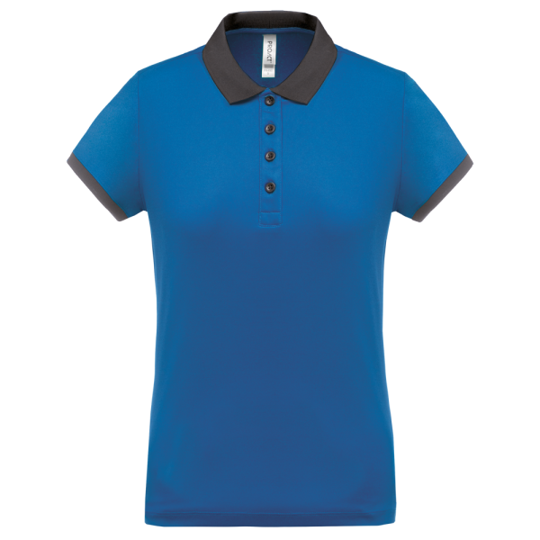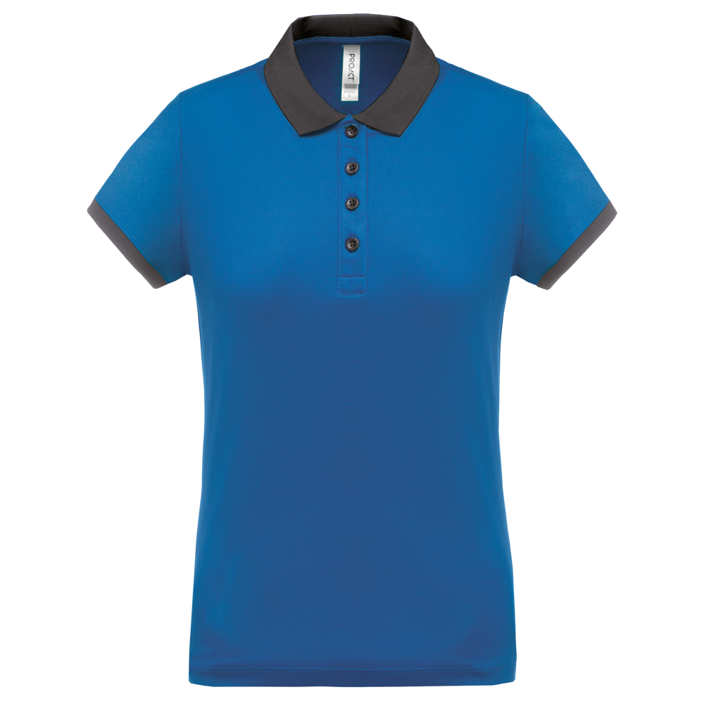 100% piquépolyester Cool Plus®. Getailleerde snit en moderne look. Kraag en mouwuiteinden in contrasterende ribboord. Knoopsluiting met 4 knopen (contrasterend of effen, afhankelijk van het model). Zijsplitten.