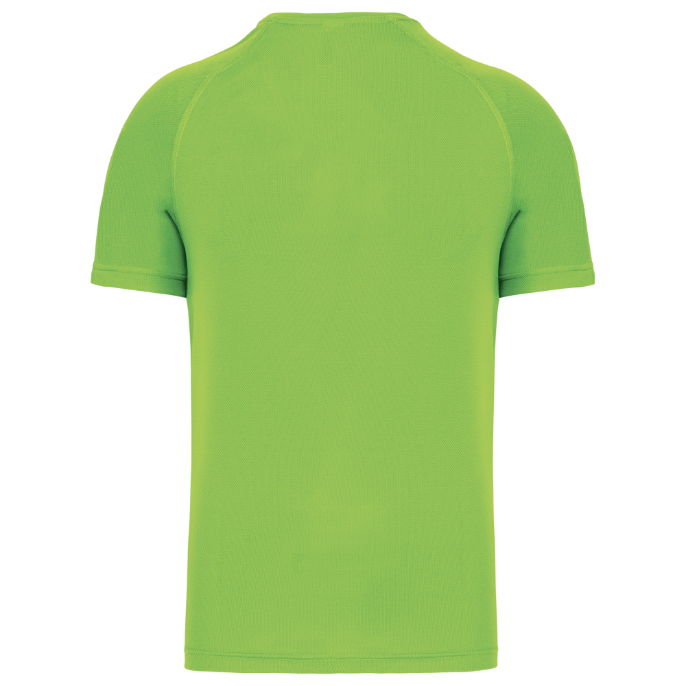 100% polyester. Sneldrogende stof. V-hals met nektape. Raglanmouwen met overlocksteek. Dubbel stiksel aan de mouwuiteinden en onderkant kledingstuk.