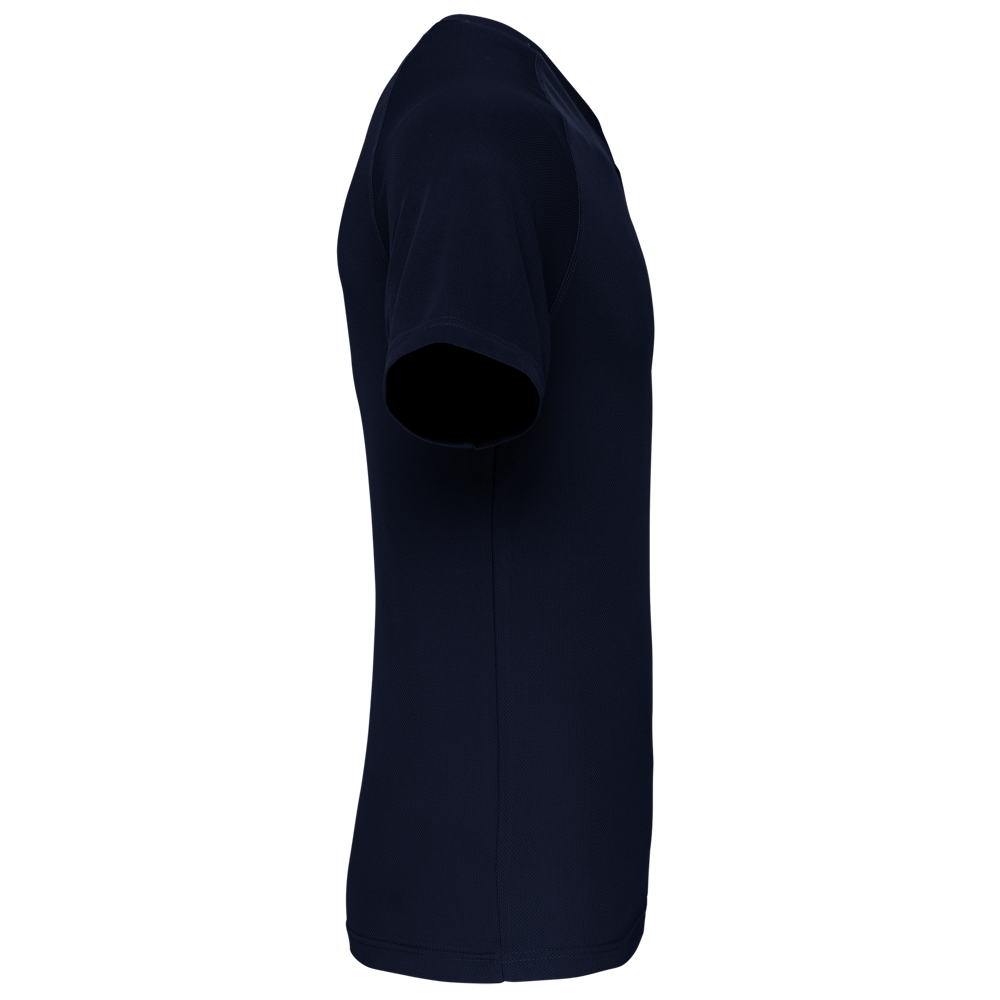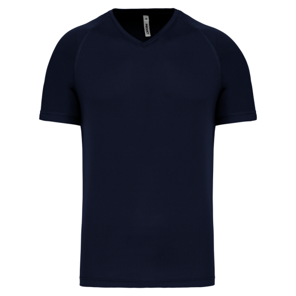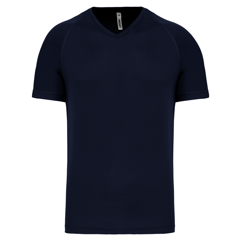 100% polyester. Sneldrogende stof. V-hals met nektape. Raglanmouwen met overlocksteek. Dubbel stiksel aan de mouwuiteinden en onderkant kledingstuk.
