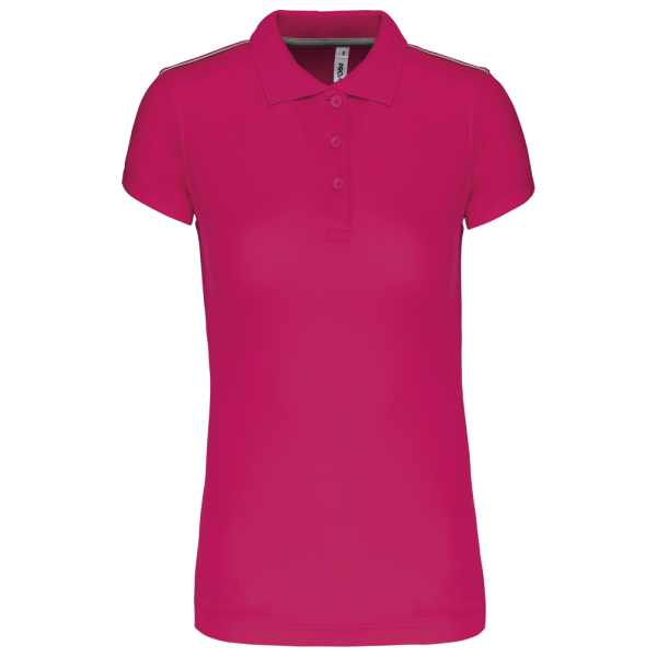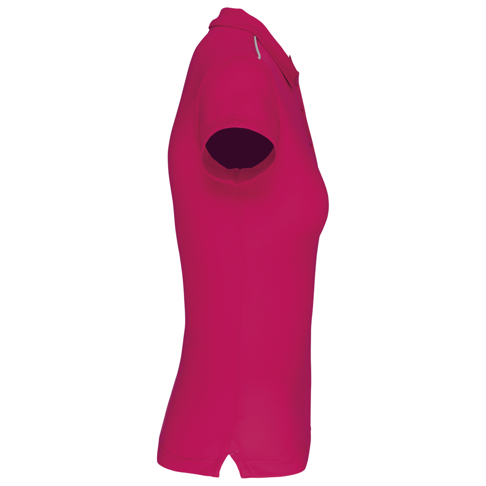 100% polyester interlock. Sneldrogende stof. Kraag in rib. Knooplijst met 3 knopen. Nektape en zijsplitjes in contrastkleur. Contrastkleurige bies op de schouders. Afwerking met dubbele stiksels aan de mouwuiteinden en onderaan.