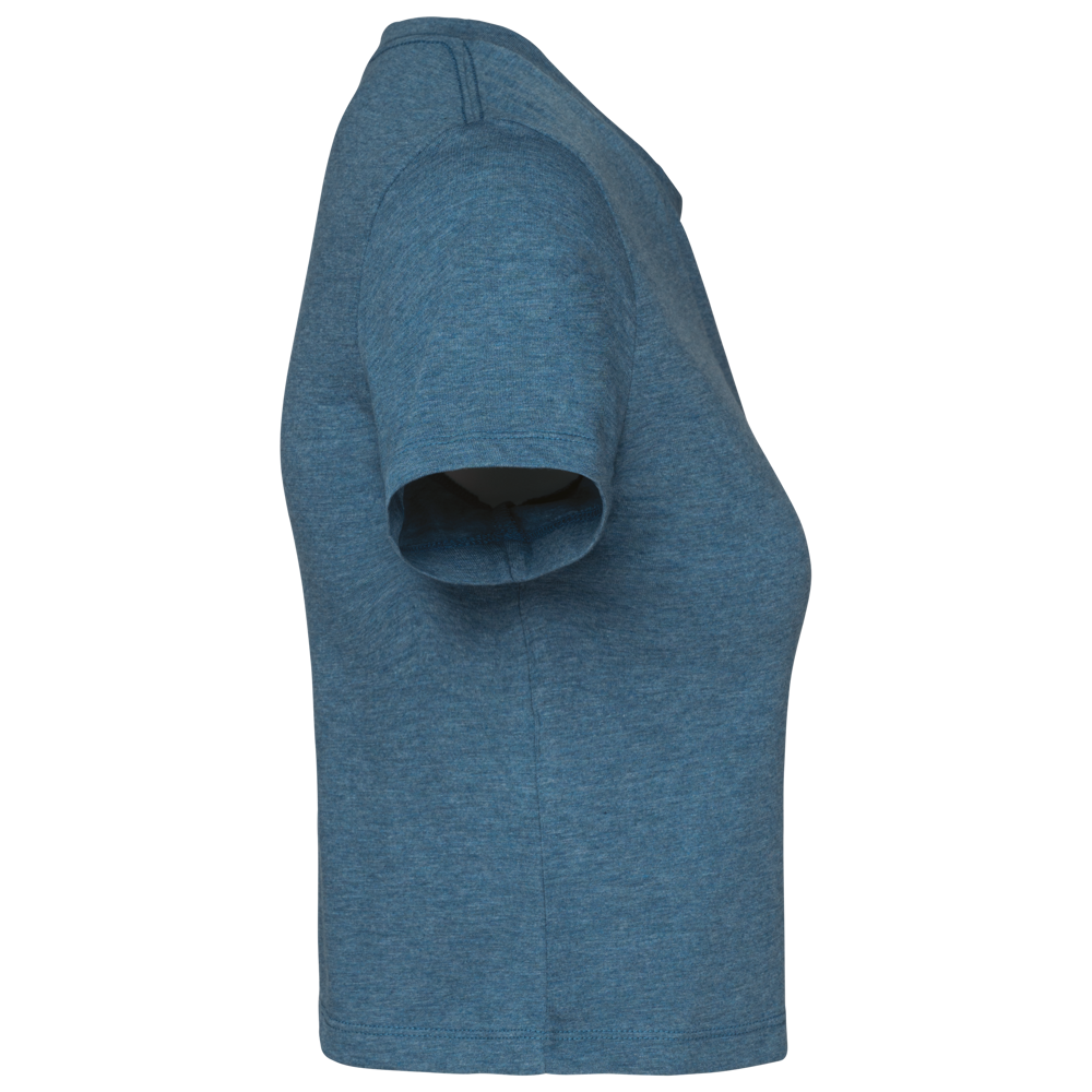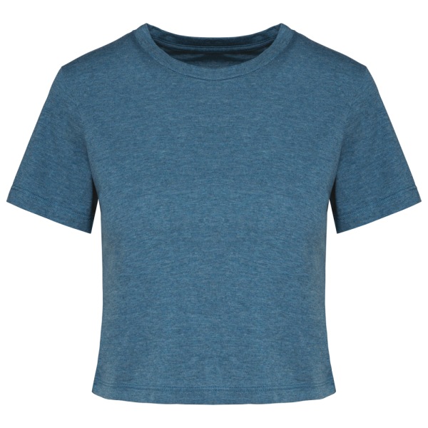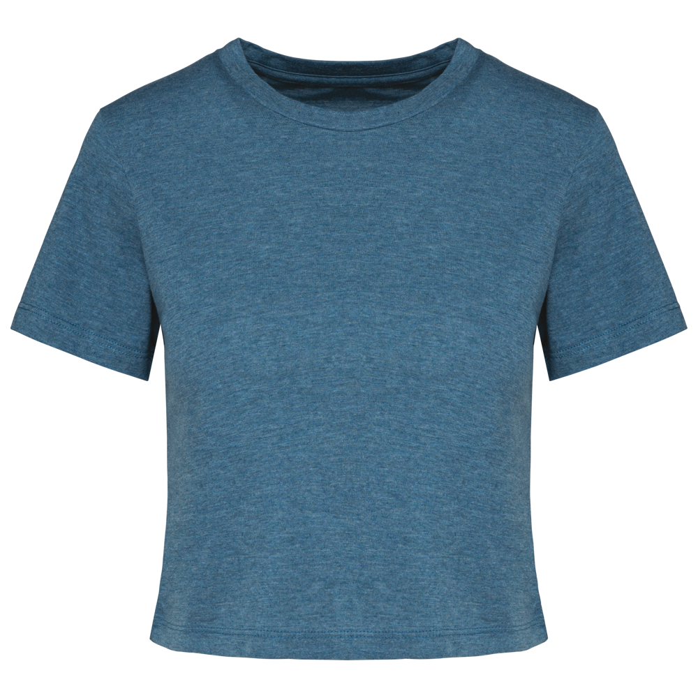 50% polyester / 25% katoen / 25% viscose. Jerseystof. Met antipluisbehandeling. Ronde hals. Rechte snit. Croptop. Ton-sur-ton nektape aan de halsopening. Dubbel stiksel aan de mouwuiteinden en aan de zoom. Buisvormige afwerking aan de mouwuiteinden. Geen merklabel, maar enkel een maatlabel voor eenvoudige personalisatie.