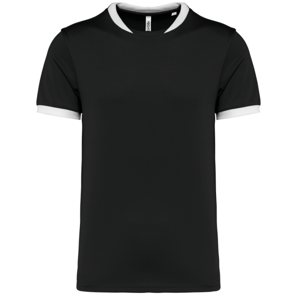 100% polyester. Interlock. Rechte snit. Cut-and-sew-techniek. Ronde hals in 1x1 ribtricot in contrasterend wit voor alle kleuren, met toon-op-toon interlock-inzetsel. Mouwuiteinden in 1x1 ribtricot in contrasterend wit voor alle kleuren. Toon-op-toon nektape van interlock. Verstevigde naden met dubbel stiksel aan de mouwuiteinden, de schouders en aan de zijkanten. Afwerking met dubbel stiksel aan de onderkant. Afneembaar merklabel.