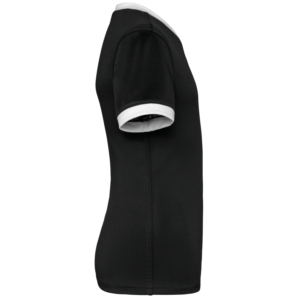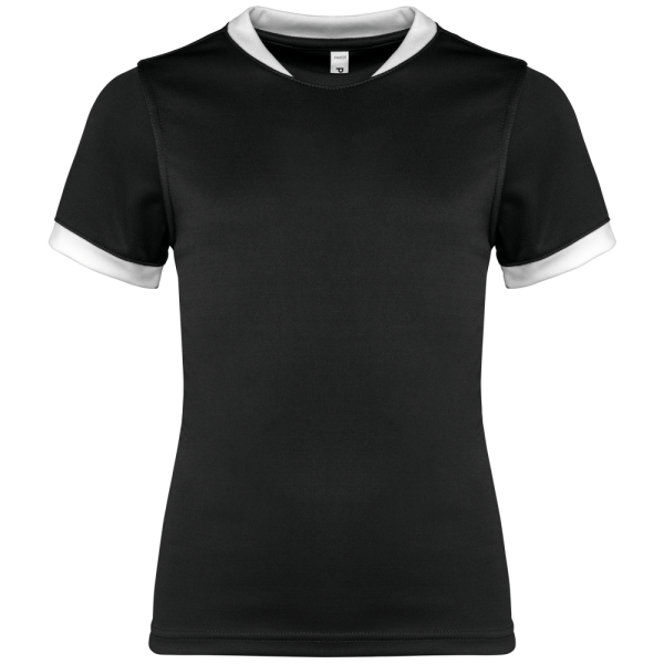 100% polyester. Interlock. Rechte snit. Cut-and-sew-techniek. Ronde hals in 1x1 ribtricot in contrasterend wit voor alle kleuren, met toon-op-toon interlock-inzetsel. Mouwuiteinden in 1x1 ribtricot in contrasterend wit voor alle kleuren. Toon-op-toon nektape van interlock. Verstevigde naden met dubbel stiksel aan de mouwopeningen, de schouders en opzij. Afwerking met dubbel stiksel onderaan. Afneembaar merklabel.