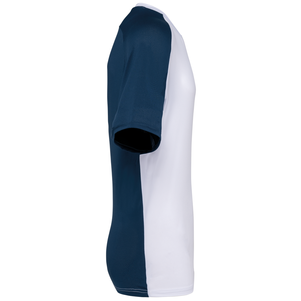 90% polyester / 10% elasthan. Birdseye-deel : 92% polyester / 8% elasthan. Contrasterende panelen in 'birdseye'. Rechte snit. Raglanmouwen. Ronde hals in jersey met toon op toon inzetsel aan de voorkant van de kraag. Toon op toon nektape in jersey. Contrasterende panelen (of effen voor de kleur Black) in birdseyetricot op de zijkanten, de mouwen en de rug. Dubbel stiksel aan mouwuiteinden en onderkant. Tear-away merklabel.