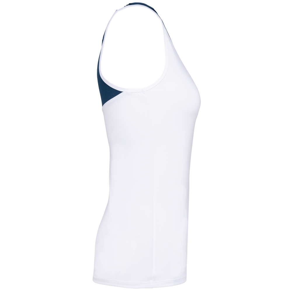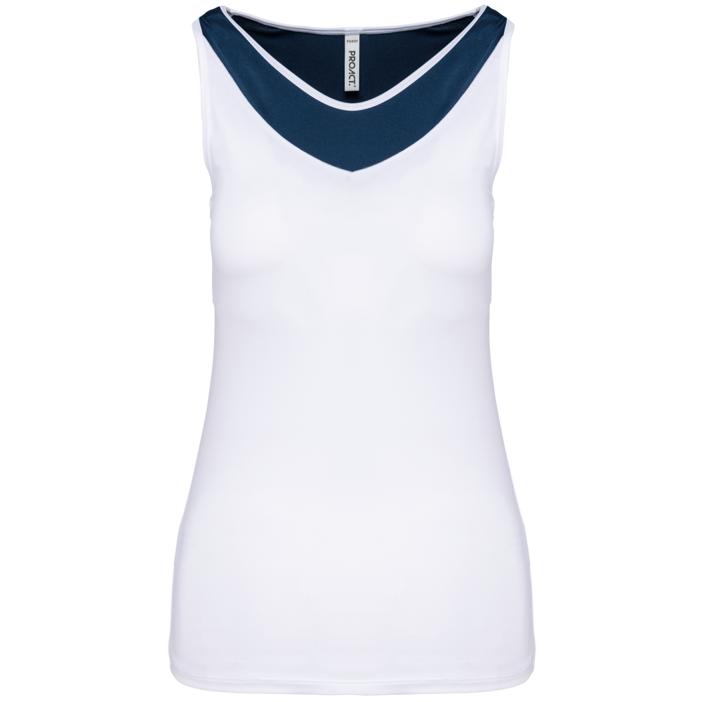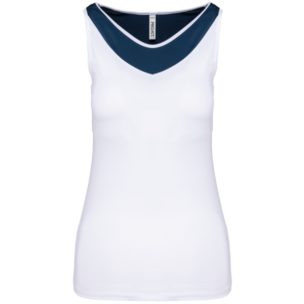 80% polyester / 20% elasthan. Contrasterende inzetsels : 90% polyester / 10% elasthan. In jersey. Slim fit. Diepe halsopening. Afgewerkt met een biesje aan de halsopening en de mouwopeningen, en een dubbel stiksel aan de onderkant. Tear-away merklabel.