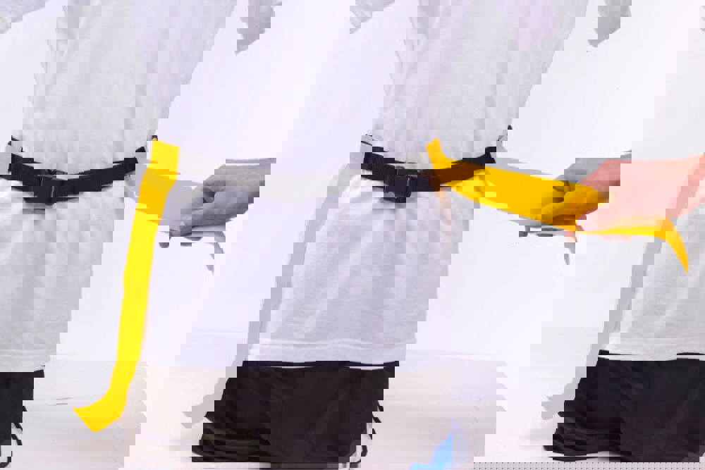 Verstelbare trainingsriem met gesp en twee stroken die vastzitten met klittenband.