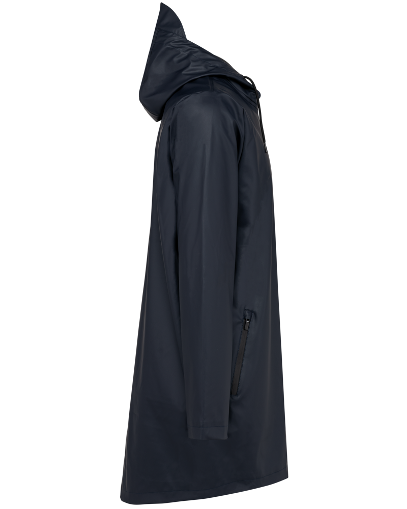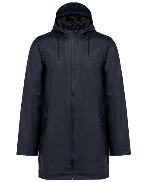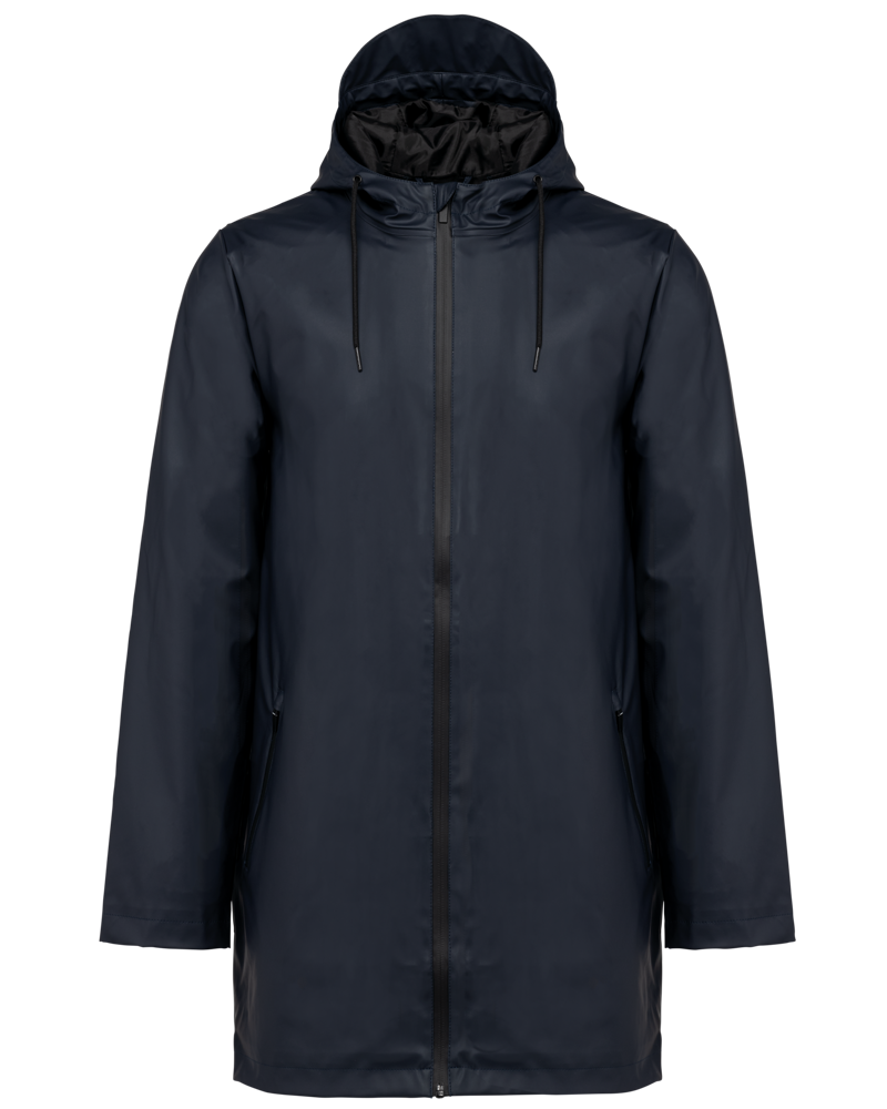 Buitenste laag in 100% polyurethaancoating en binnenste laag in 100% polyester. Thermogelaste naden. Waterdicht 5000 mm. Voering 100% polyester. Capuchon met zonneklep en aanrijgkoordjes met metalen stopper. Ritssluiting tot aan de capuchon met verborgen trekker. 2 zijzakken met waterdichte ritssluiting en verborgen trekker. Verluchtingsgaatjes aan de oksels. Langer achterpand met een ruimtesplit onderaan. Lus aan de binnenkant van de kraag om het jasje te kunnen ophangen. Personaliseerbare patch bovenaan de rug aan de binnenkant. Een drukkersrits aan de binnenkant, op de achterkant onderaan en op de hartkant. Geen merklabel, maar enkel een maatlabel voor eenvoudige personalisatie.