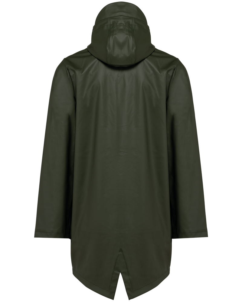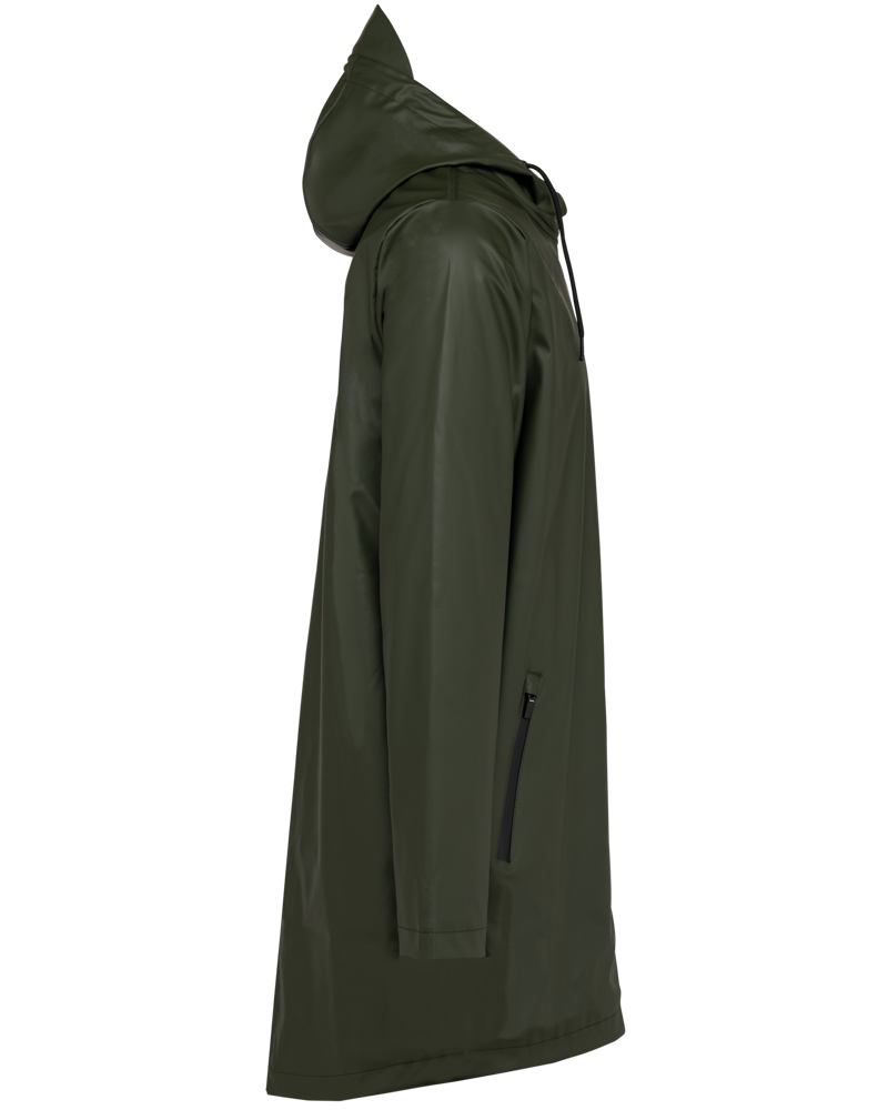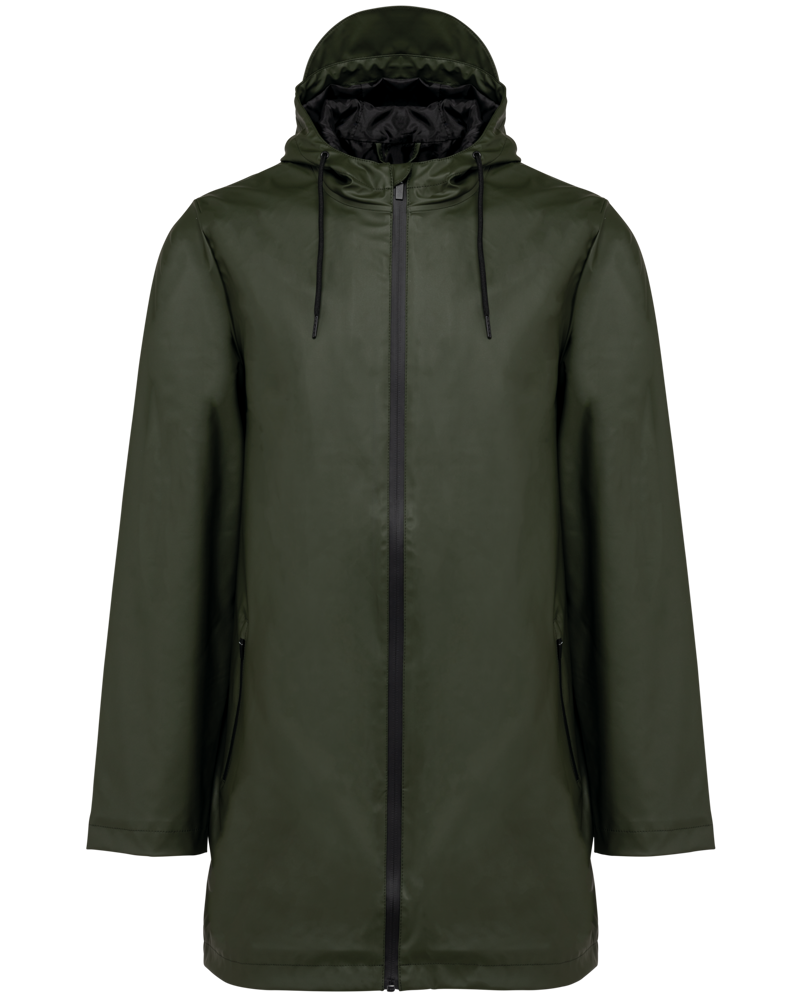 Buitenste laag in 100% polyurethaancoating en binnenste laag in 100% polyester. Thermogelaste naden. Waterdicht 5000 mm. Voering 100% polyester. Capuchon met zonneklep en aanrijgkoordjes met metalen stopper. Ritssluiting tot aan de capuchon met verborgen trekker. 2 zijzakken met waterdichte ritssluiting en verborgen trekker. Verluchtingsgaatjes aan de oksels. Langer achterpand met een ruimtesplit onderaan. Lus aan de binnenkant van de kraag om het jasje te kunnen ophangen. Personaliseerbare patch bovenaan de rug aan de binnenkant. Een drukkersrits aan de binnenkant, op de achterkant onderaan en op de hartkant. Geen merklabel, maar enkel een maatlabel voor eenvoudige personalisatie.