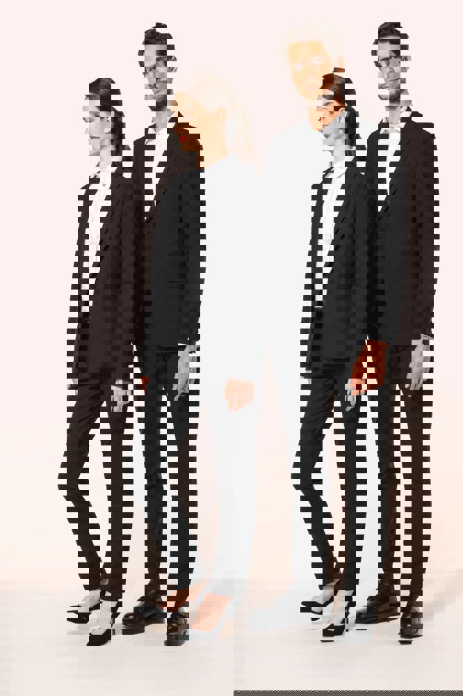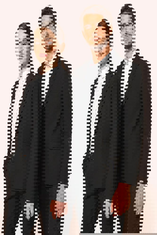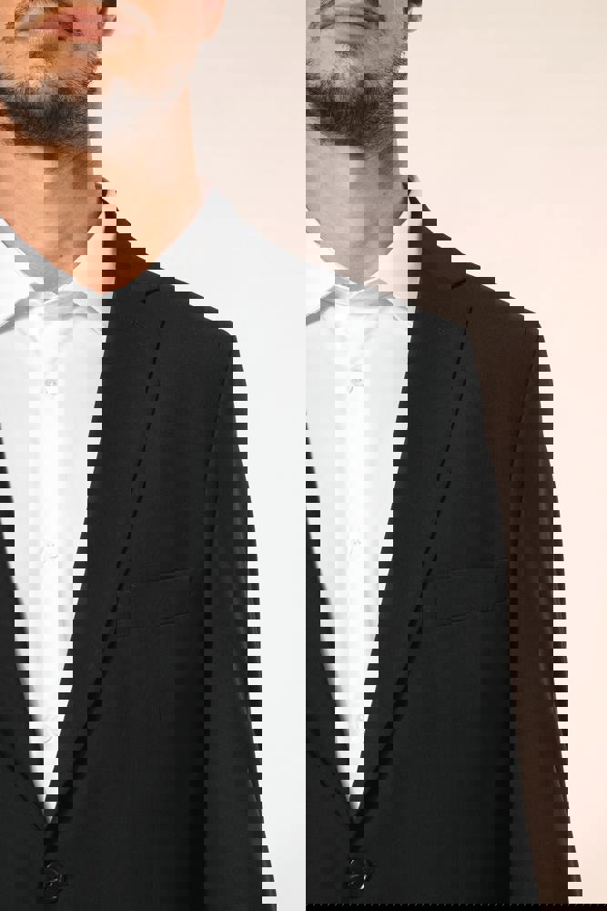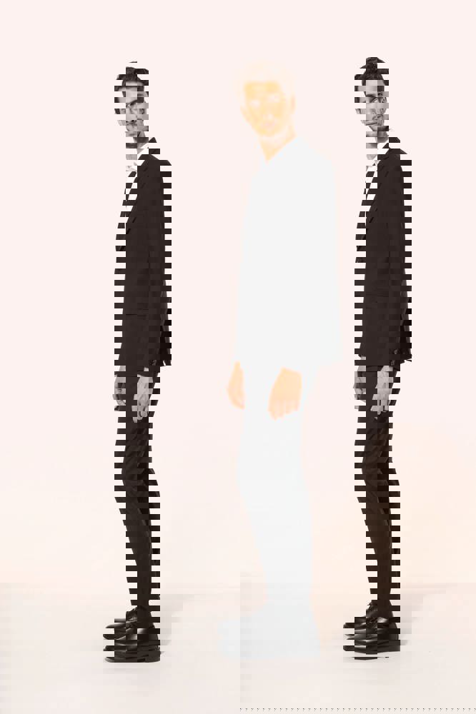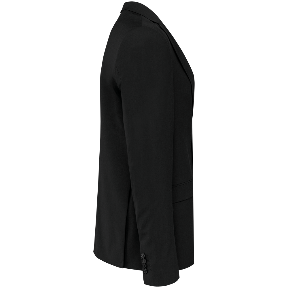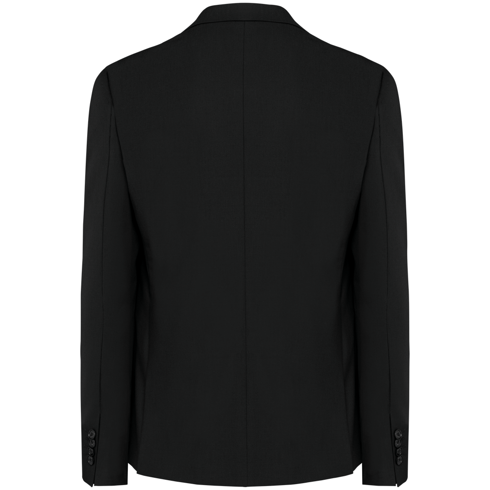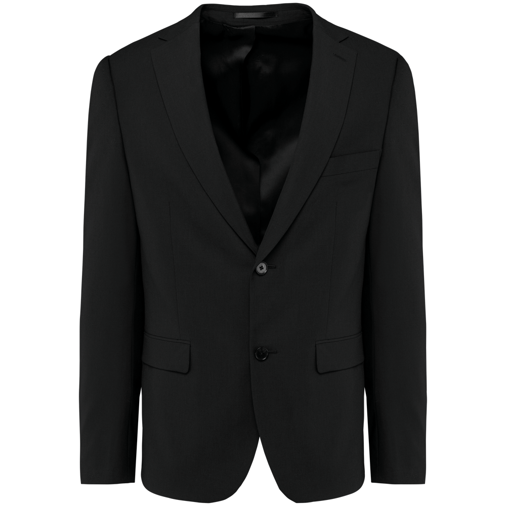 50% polyester / 23% viscose / 22% wol / 5% elasthan. Toon-op-toon voering in twill (100% polyester). Rechte snit. Jasje met twee ton-sur-ton knopen. Twee zakken met biesjes en kleppen, en een borstzakje met bies op de hartzijde. Vals toon-op-toon knoopsgat op de revers. Inzetsel opzij om het product vorm te geven. Satijnen ophanglus in de halsopening. Naad midden op de rug, Twee splitten onderaan. Mouwuiteinden met valse split en 4 toon-op-toon knopen. De twee borstzakjes binnenin zijn afgewerkt met een contrasterende bies. Links aan de binnenkant (bij het dragen) zitten een telefoonzakje en een ticketzakje met toon-op-toon bies. Drukkersrits aan de linkerkant (bij het dragen). Geen merklabel, maar enkel een maatlabel voor eenvoudige personalisatie.