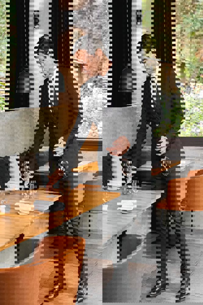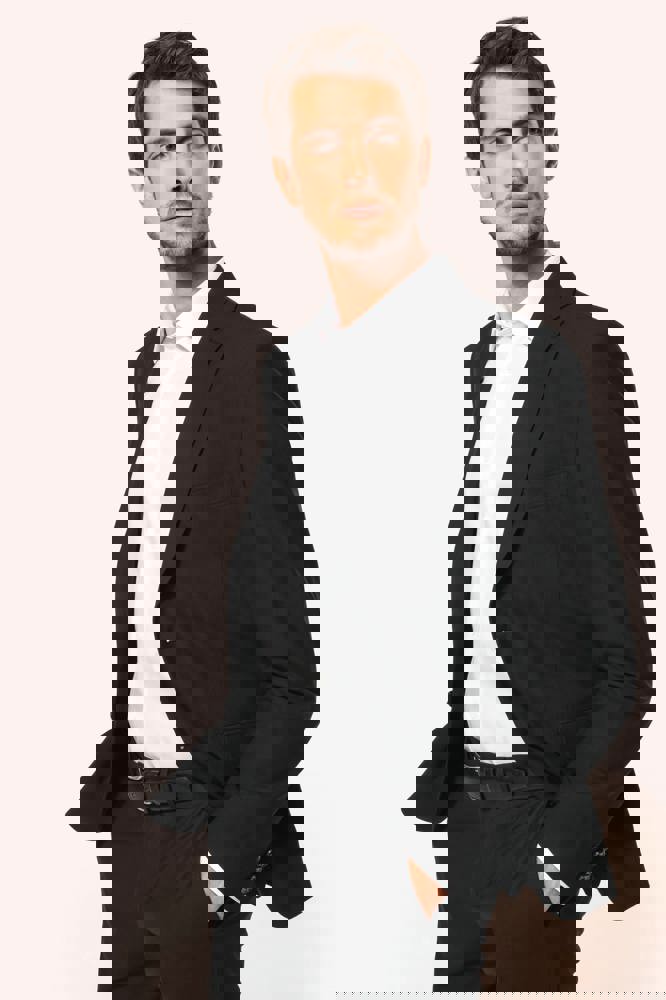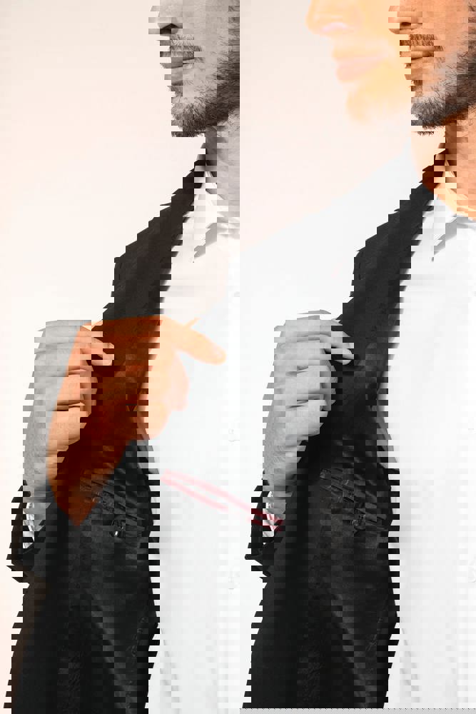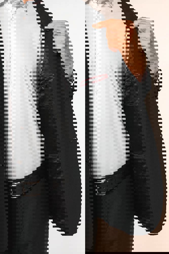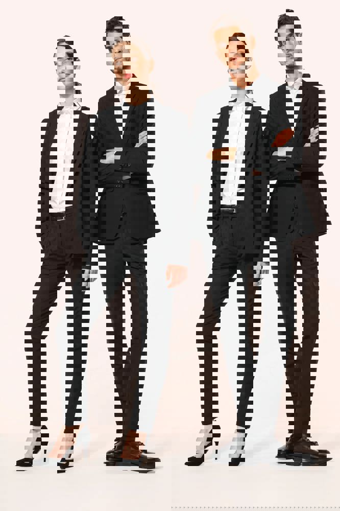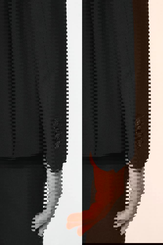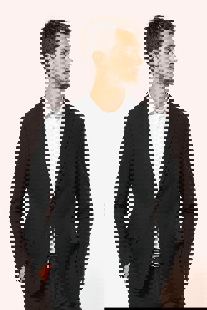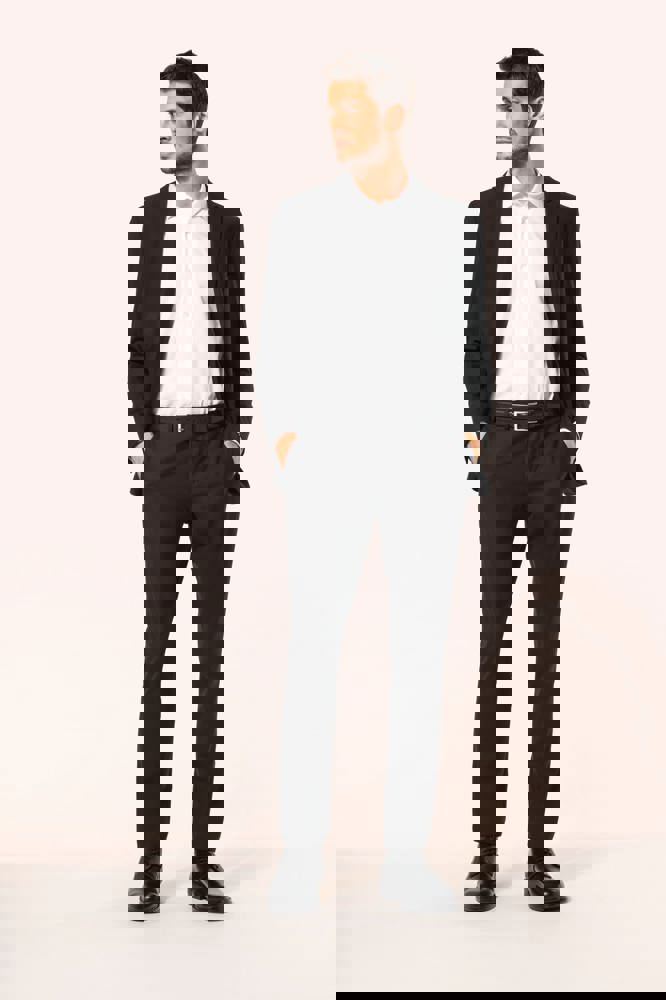 50% polyester / 23% viscose / 22% wol / 5% elasthan. Toon-op-toon voering in twill (100% polyester). Rechte snit. Jasje met twee ton-sur-ton knopen. Twee zakken met biesjes en kleppen, en een borstzakje met bies op de hartzijde. Vals toon-op-toon knoopsgat op de revers. Inzetsel opzij om het product vorm te geven. Satijnen ophanglus in de halsopening. Naad midden op de rug, Twee splitten onderaan. Mouwuiteinden met valse split en 4 toon-op-toon knopen. De twee borstzakjes binnenin zijn afgewerkt met een contrasterende bies. Links aan de binnenkant (bij het dragen) zitten een telefoonzakje en een ticketzakje met toon-op-toon bies. Drukkersrits aan de linkerkant (bij het dragen). Geen merklabel, maar enkel een maatlabel voor eenvoudige personalisatie.
