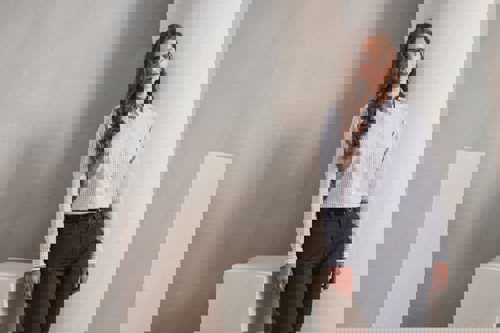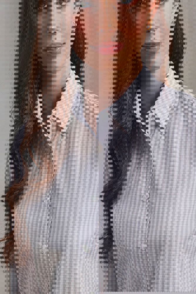 65% polyester / 35% kleurgeweven popelinekatoen. Overhemd met lange mouwen met knopen aan de mouwen. Knoop aan de kraag. Plooi op borst en rug.