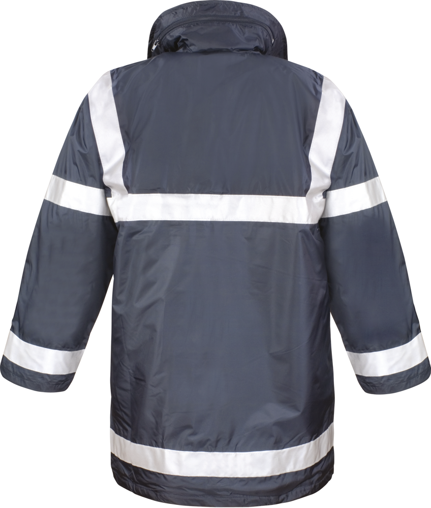 Buitenkant 100% 190T polyester StormDri met PVC coating. Gewatteerde voering van polyester 140 gram. Voering 190T polyester in ruitvorm. Waterdicht 1600mm en winddicht. Getapete naden. Capuchon met aanrijgkoordjes in de kraag. Volledige ritssluiting. Stormoverslag met drukknopen. 2 ruime zijzakken, 1 binnenzak en 1 zak voor gsm. 3M™ Scotchlite™ reflecterende banden 50mm genaaid. Drukkersrits.