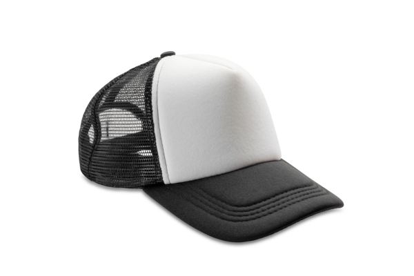 Gewatteerd met 100% polyester. 5 panelen: 4 van mesh en 1 van stof. Wit voorpaneel. Regelbaar met plastic Snapback-retrotong. Half gebogen zonneklep van stof. Wasbaar met de hand.