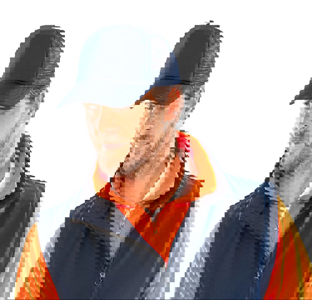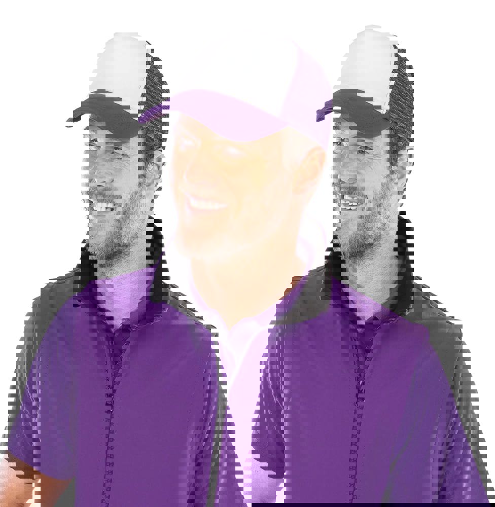 Gewatteerd met 100% polyester. 5 panelen: 4 van mesh en 1 van stof. Wit voorpaneel. Regelbaar met plastic Snapback-retrotong. Half gebogen zonneklep van stof. Wasbaar met de hand.