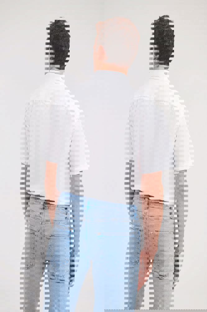 65% polyester / 35% gekamd katoen popline. Classic fit. Easy Care. Klassieke verstevigde kraag. Inzetstuk op de achterkant met 2 plooitjes. Knopen toon op toon. Reserveknoop. Open borstzakje links. Rechte onderkant.