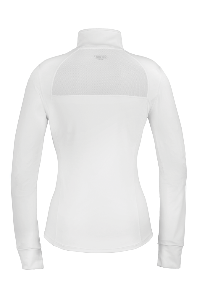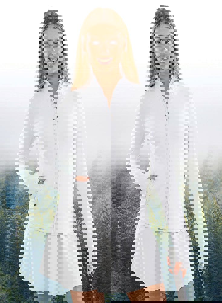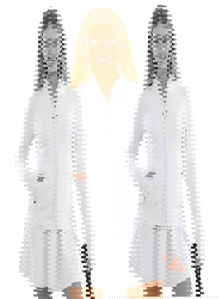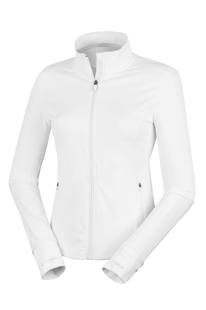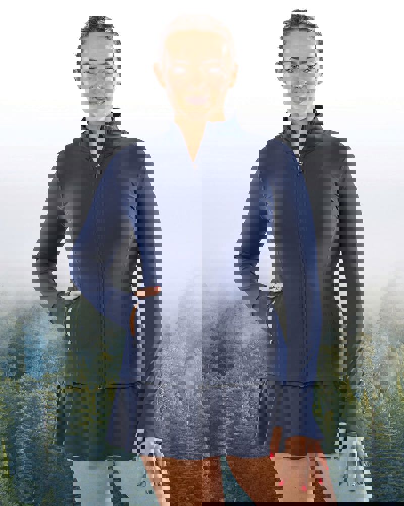 78% gerecycled polyester, 22% elastaan. Getailleerd en zeer rekbaar dames sportjack, gemaakt van gerecyclede stoffen. Ideaal voor tennis en alle sporten. De manchetten voorkomen het oprollen van de mouwen en beschermen de handpalm. Ritssluiting aan de voorkant bij de kraag en zijzakken met rits.