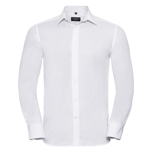 70% katoen / 30% polyester oxford. Getailleerd. Verstevigde Kent kraag met versterkte punten. Verstelbare manchetten met afgeronde hoeken. Easy Care.