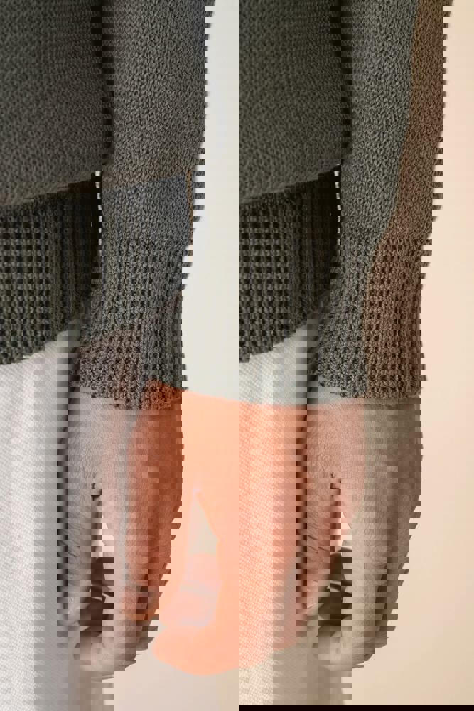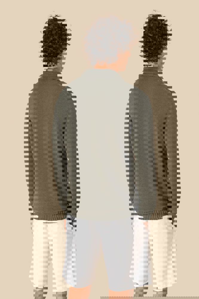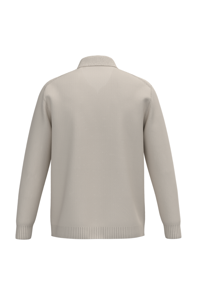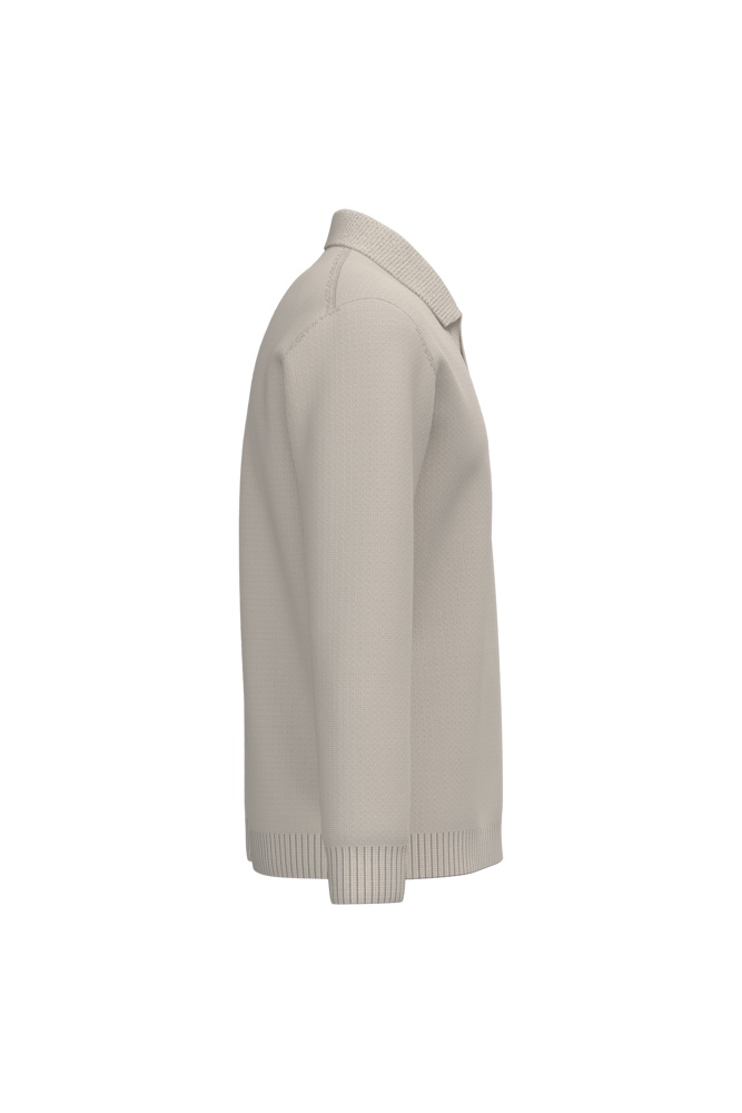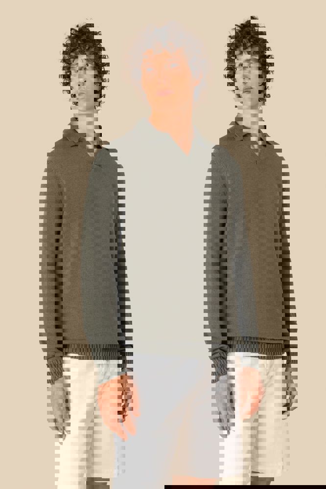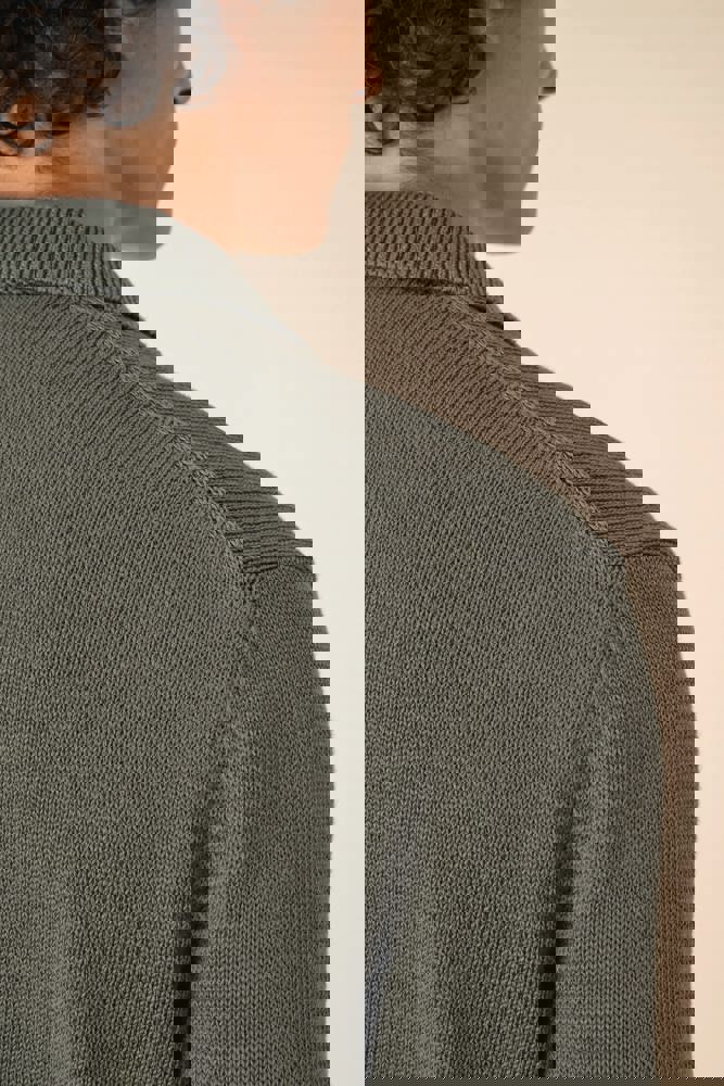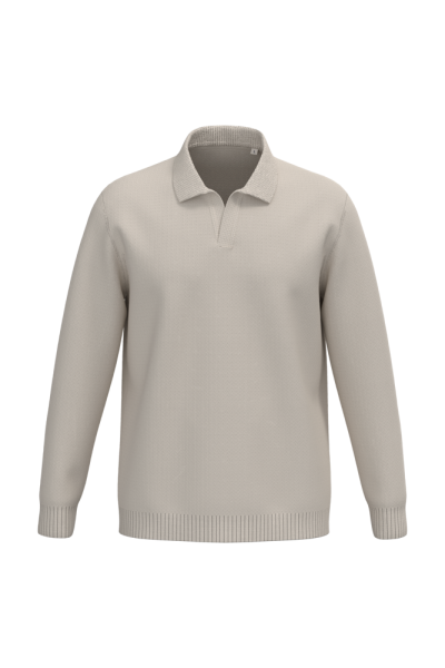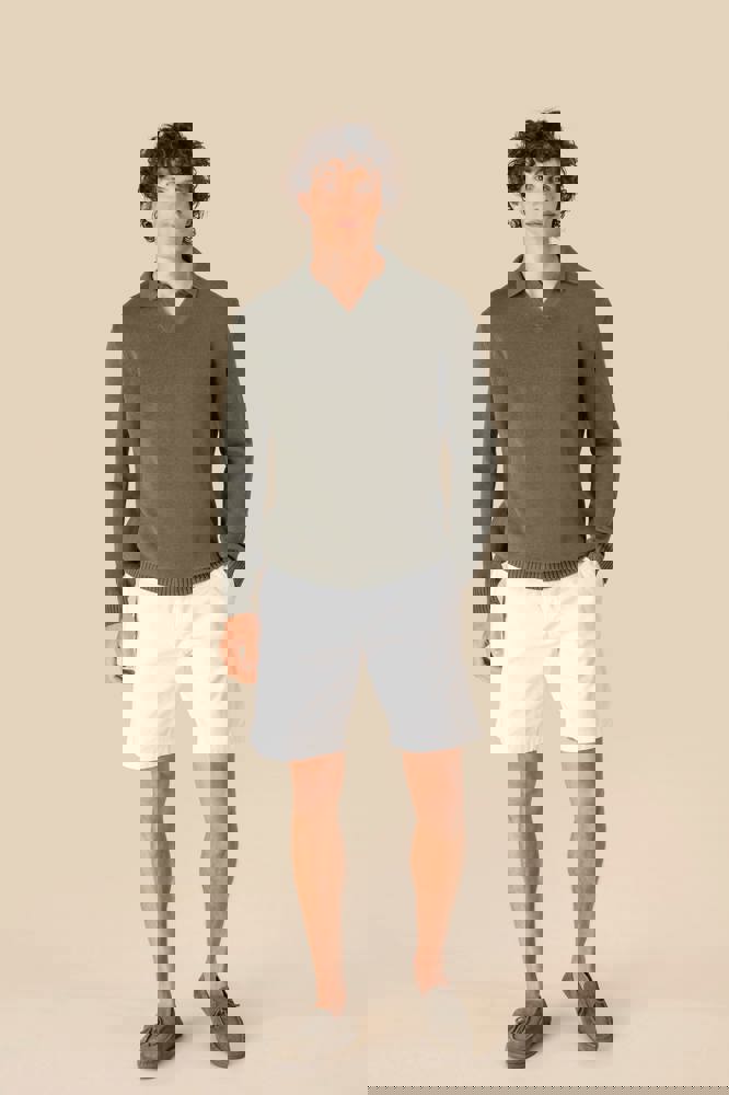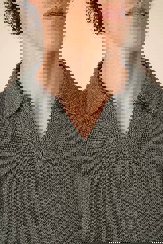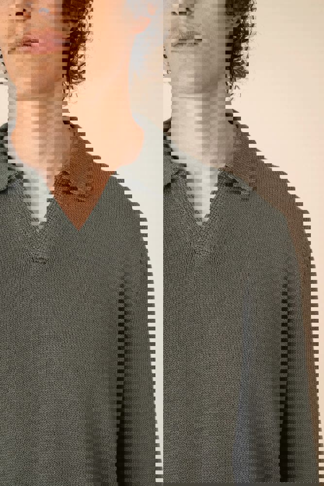 100% katoen. Gekamd katoen. Tricot. Gauge 7. Rechte snit. Kraag en V-hals zonder knoopje in polostijl. 1x1 ribboord in de kraag. 2x2 ribboord aan de zoom en de mouwuiteinden. Breiwerk in 'Fully Fashion'. Gemiddeld gewicht in maat L: 460 g.