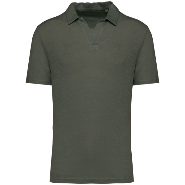 100 % linnen. Tricot. Rechte snit. Polokraag met staander en V-hals. met knooplijst zonder knoop in de hoofdstof. Dubbel stiksel aan de mouwboorden en de zoom. Zijsplitten met aan de binnenkant nektape in de hoofdstof. Halvemaan op de achterkant.