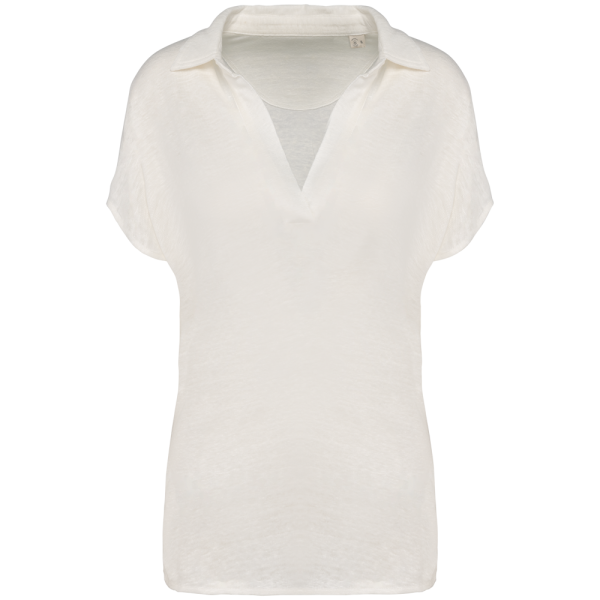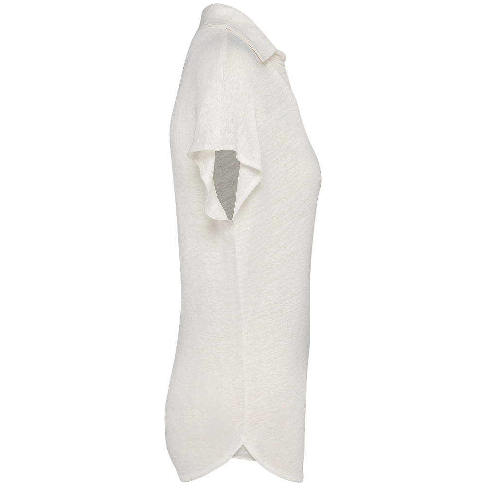 100 % Linnen. Tricot. Regular fit met afhangende mouwen. Zijsplitten met een driehoekje. Polokraag met staander en V-hals met knooplijst zonder knoop in de hoofdstof. Dubbel stiksel aan de mouwboorden en de zoom. Halvemaan op de achterkant.