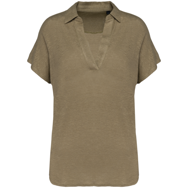 100 % Linnen. Tricot. Regular fit met afhangende mouwen. Zijsplitten met een driehoekje. Polokraag met staander en V-hals met knooplijst zonder knoop in de hoofdstof. Dubbel stiksel aan de mouwboorden en de zoom. Halvemaan op de achterkant.