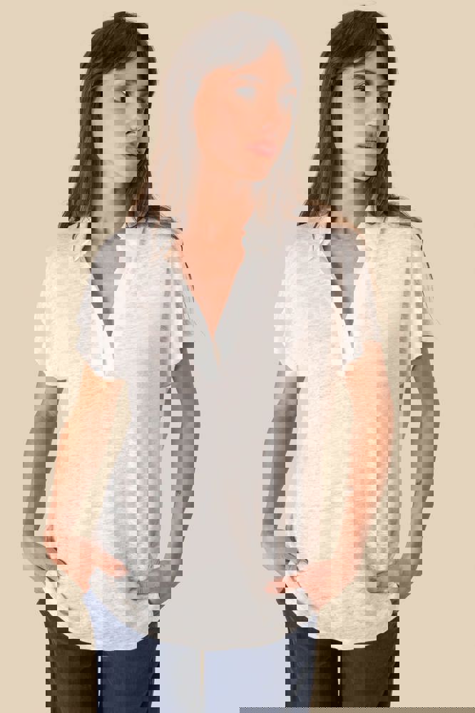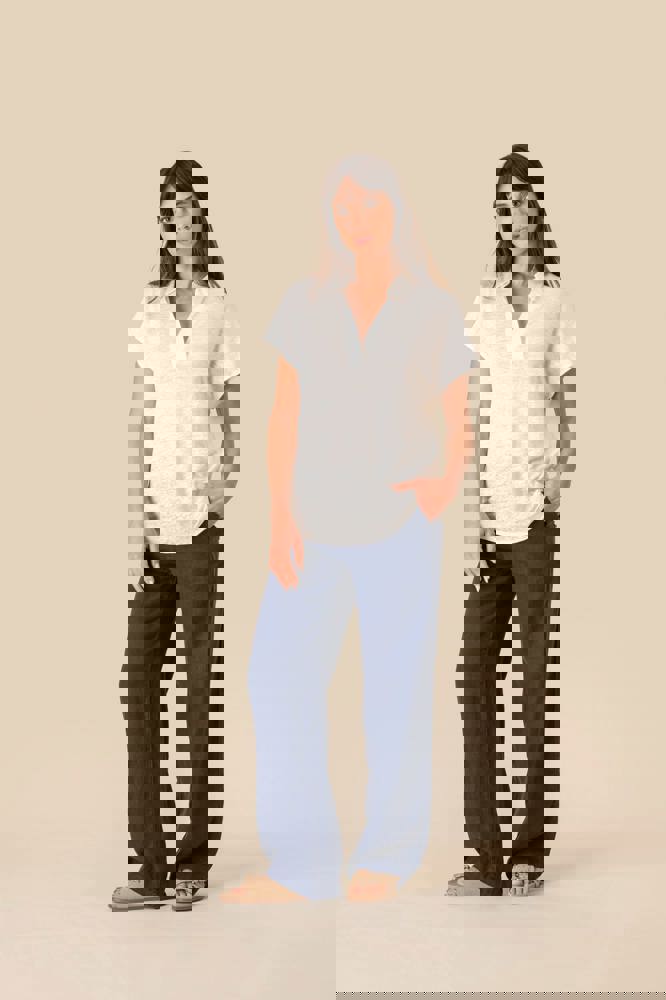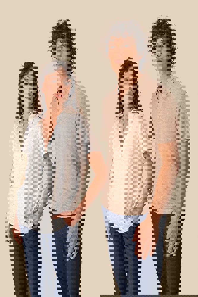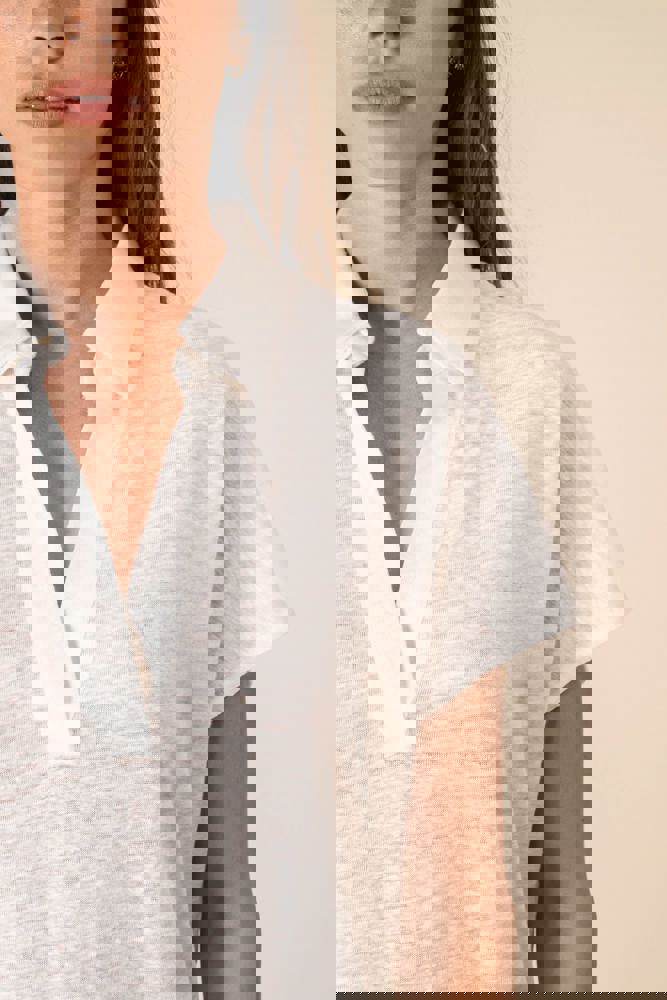 100 % Linnen. Tricot. Regular fit met afhangende mouwen. Zijsplitten met een driehoekje. Polokraag met staander en V-hals met knooplijst zonder knoop in de hoofdstof. Dubbel stiksel aan de mouwboorden en de zoom. Halvemaan op de achterkant.