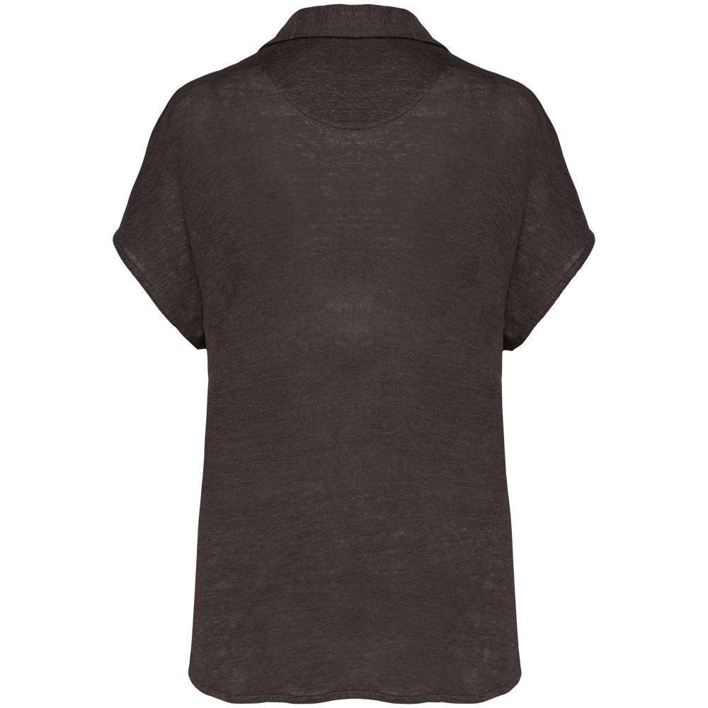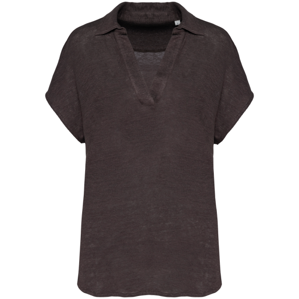 100 % Linnen. Tricot. Regular fit met afhangende mouwen. Zijsplitten met een driehoekje. Polokraag met staander en V-hals met knooplijst zonder knoop in de hoofdstof. Dubbel stiksel aan de mouwboorden en de zoom. Halvemaan op de achterkant.