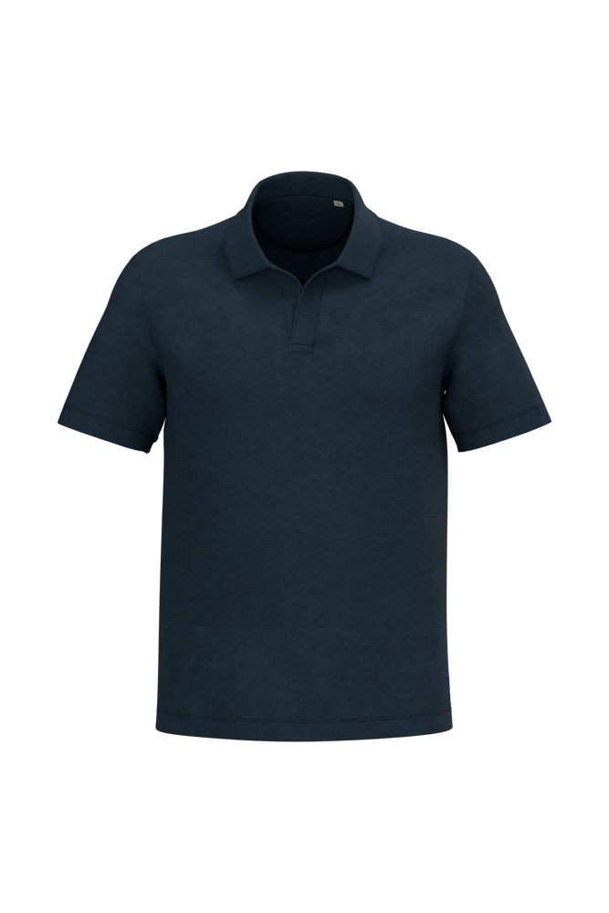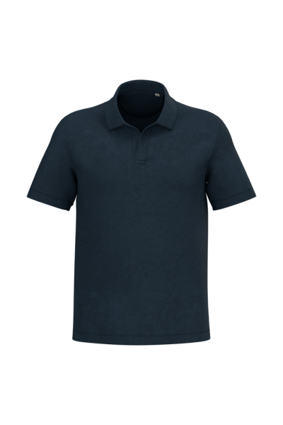 80% biologisch katoen / 20% post-consumer gerecycled polyester. Gemaakt in Portugal. Gekamd katoen. In spons. Rechte snit. Enzymgewassen. Polokraag en V-hals zonder knoopje in de hoofdstof. Schouderversteviging. Afgewerkt met dubbel stiksel aan de mouwuiteinden en de onderkant. Halvemaan op de achterkant.