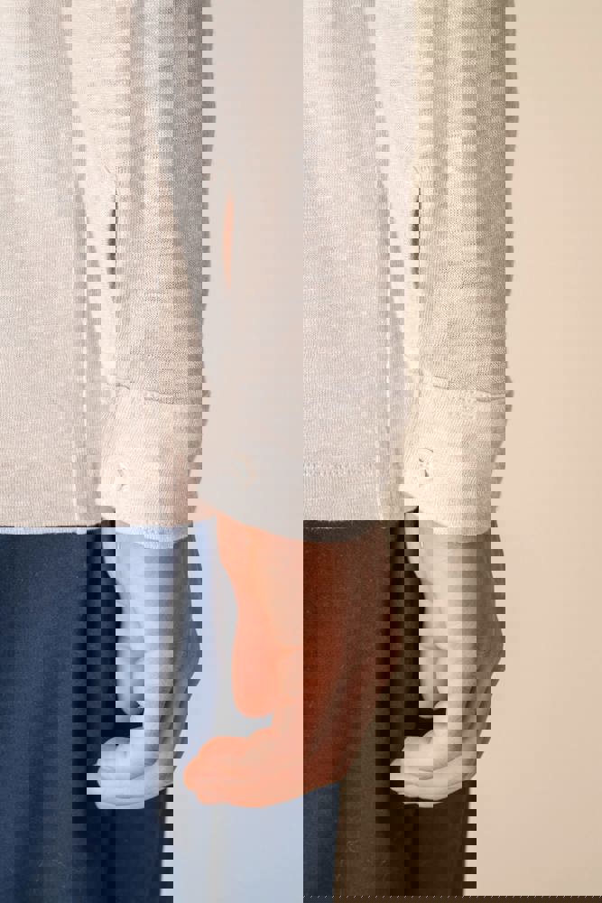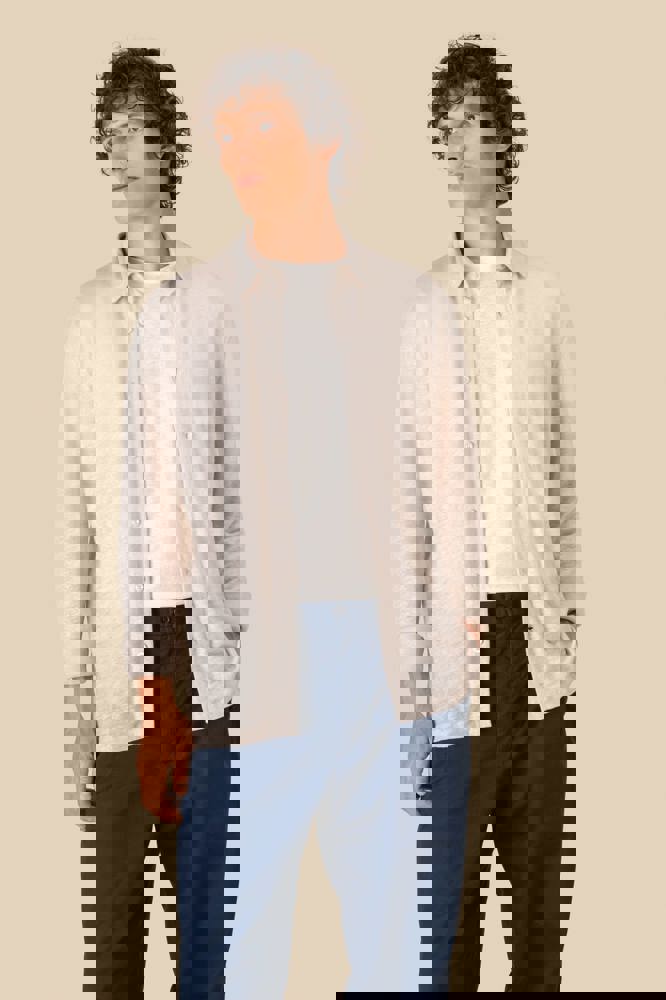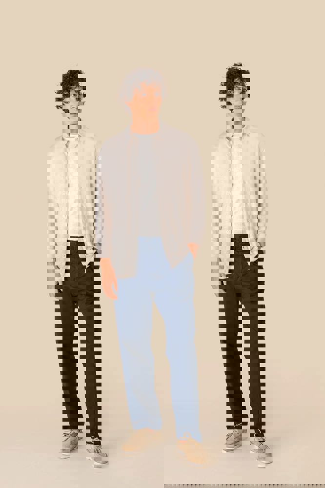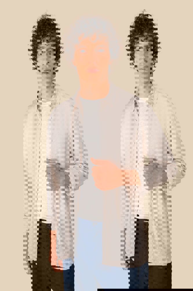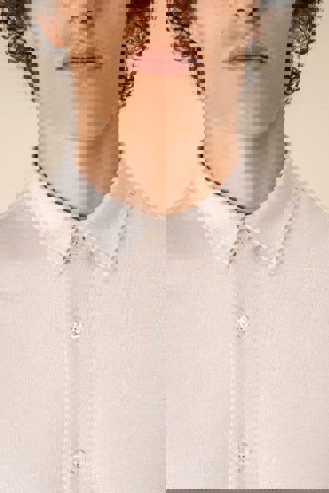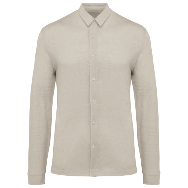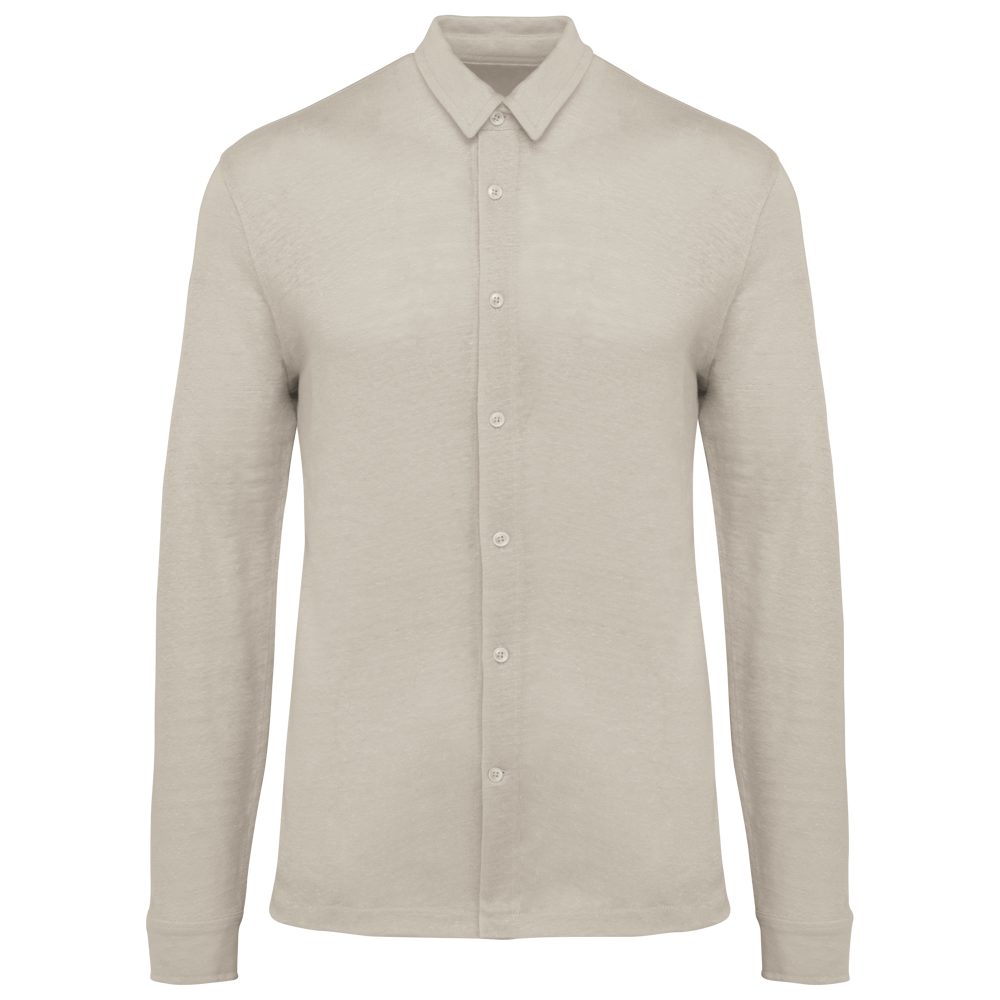 100% linnen. Tricot. Rechte snit. Kraag met staander. Inzetsel op de rug. Manchet met knoop en split. Knooplijst met contrasterende knopen in gerecycled plastic met parelmoerlook voor alle kleuren. Enkel stiksel op de zoom onderaan.