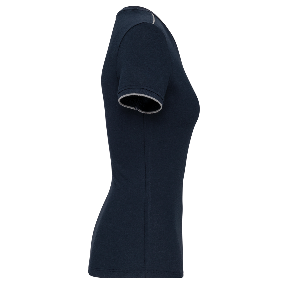65% polyester / 35% katoen. Gekamd katoen jerseystof. Wasbaar op 60 °C. Anti-pluisbehandeling. Ronde hals met elasthan. Contrasterende bies aan binnenkant kraag en schouders. Mouwuiteinden in ribboord met contrasterend biesje. Afwerking met dubbel stiksel onderaan. Ideaal voor dagelijks gebruik.