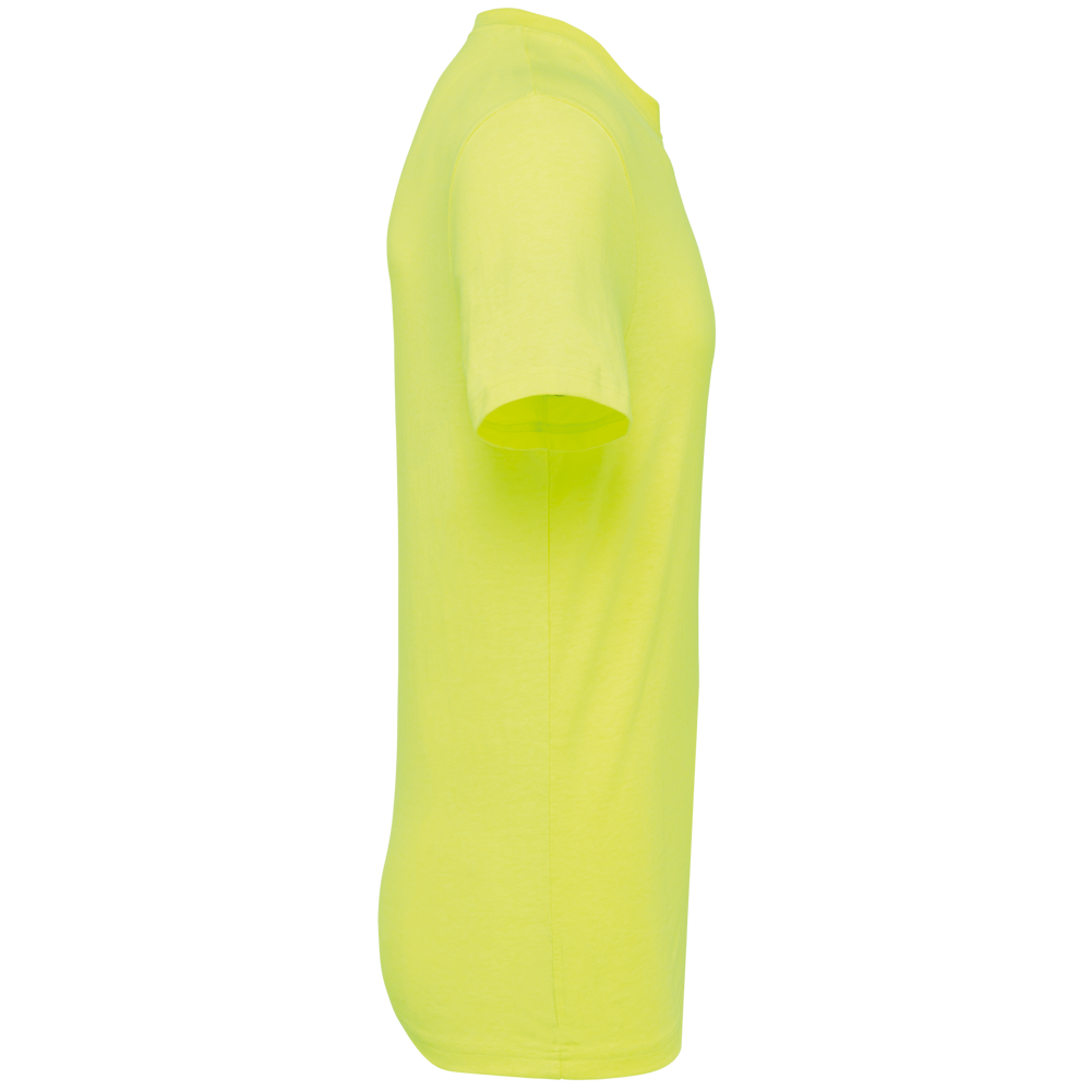 Effen kleuren: 100% katoen. Gemaakt van 100% biologisch katoen. Gevlamde kleuren: 90% katoen / 10% viscose. Gemaakt van 90% biologisch katoen. Fluokleuren: 65% polyester / 35% katoen. Gemaakt van 65% gerecycleerd polyester. Regular fit. Ronde halsopening in 2x1 ribboord met elasthan en silver nektape op de effen en gevlamde kleuren en toon-op-toon op de fluokleuren. Dubbel stiksel aan mouwuiteinden en onderkant. Tear-away merklabel.
