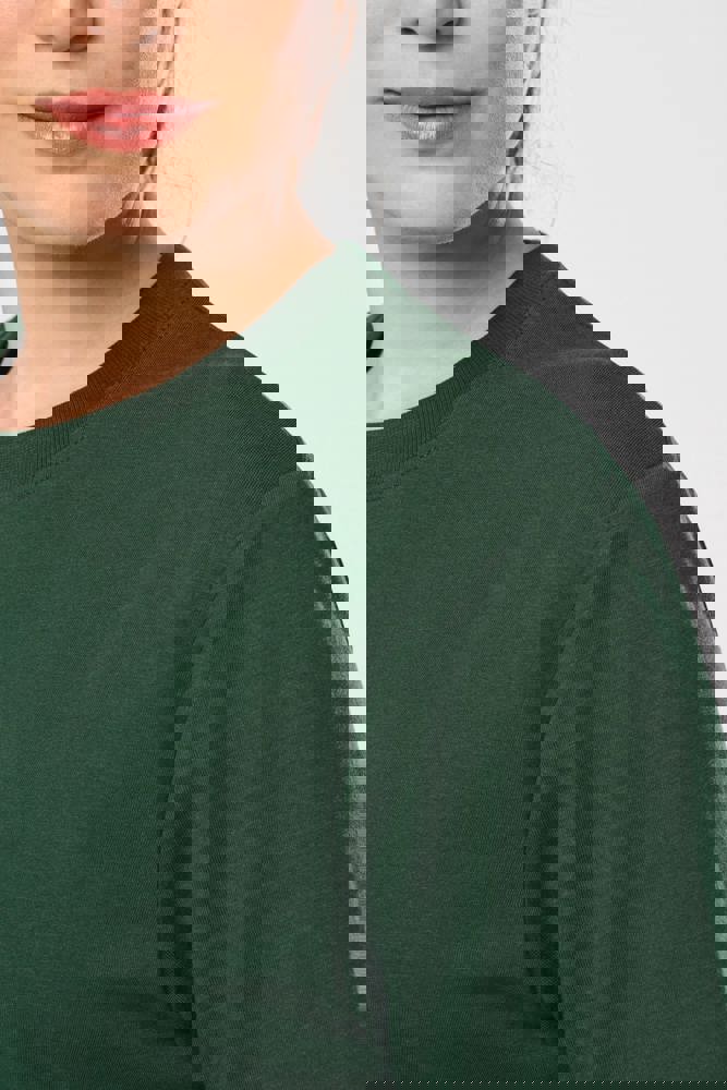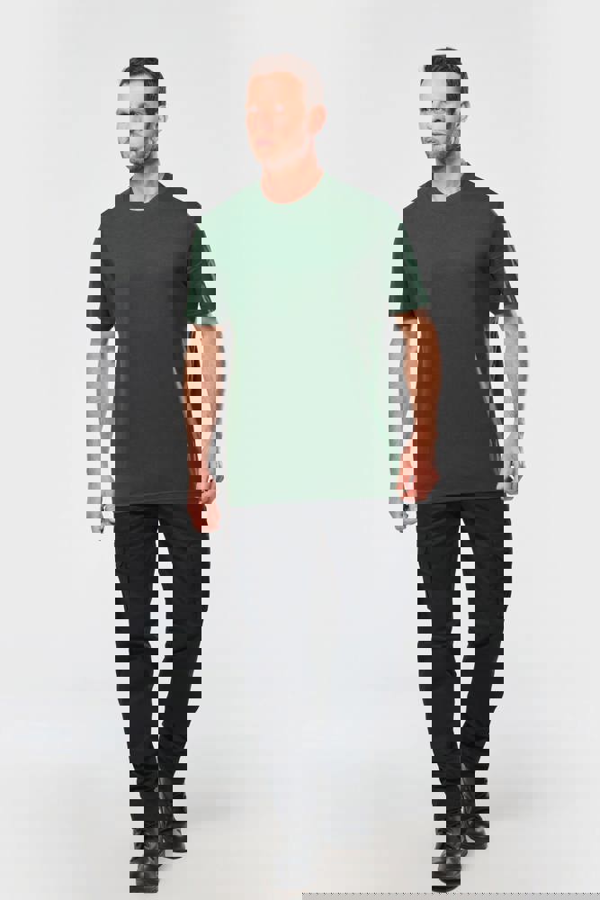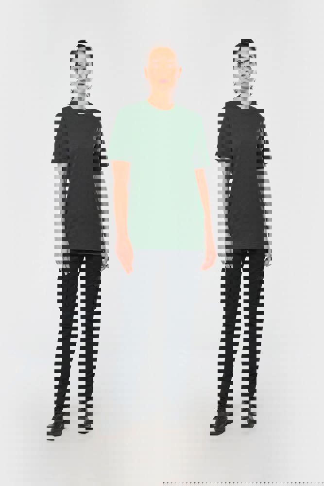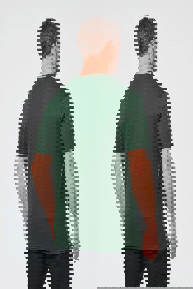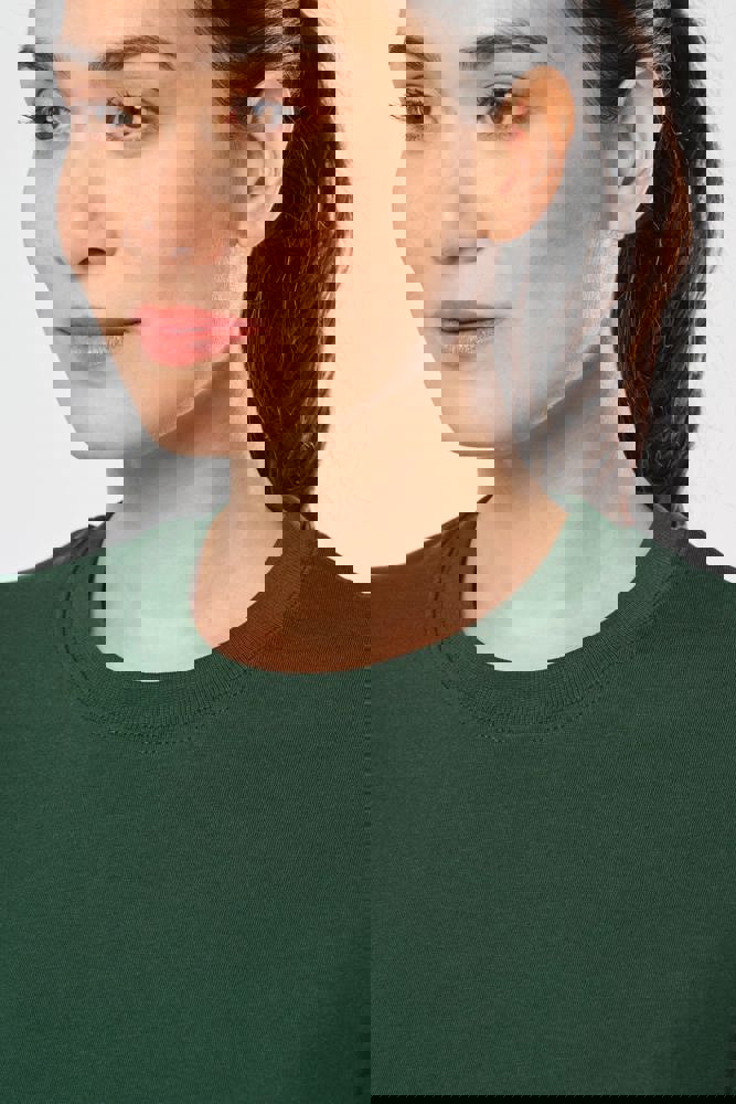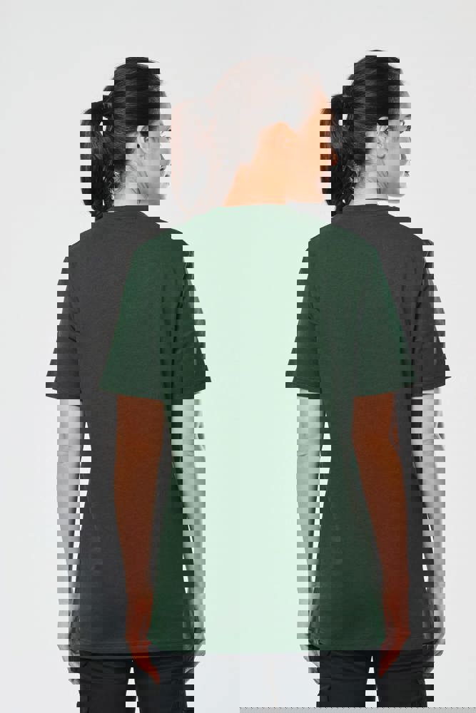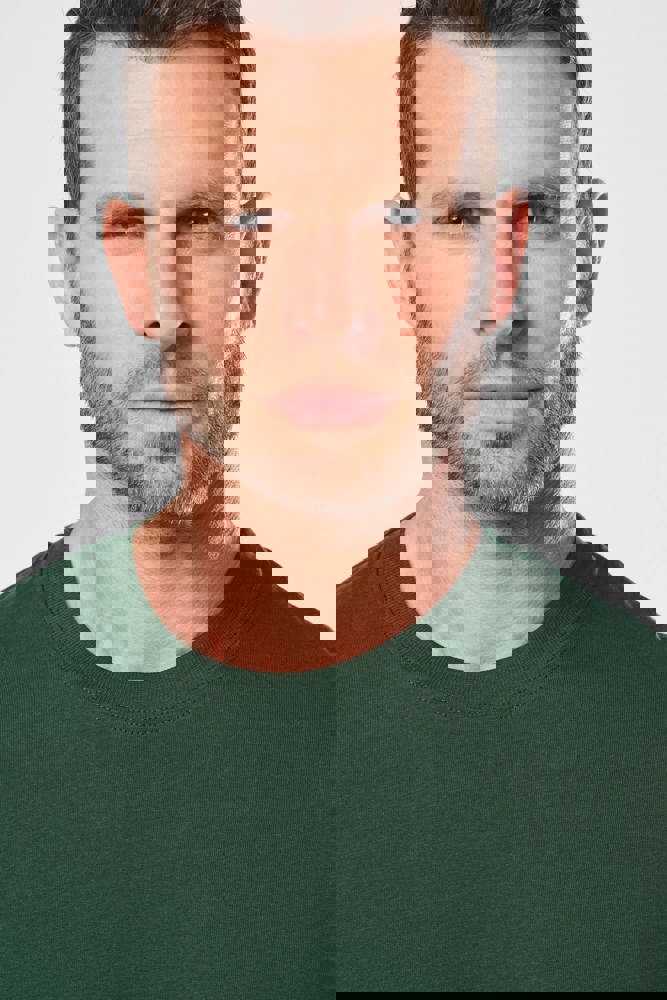 Effen kleuren: 100% katoen. Gemaakt van 100% biologisch katoen. Gevlamde kleuren: 90% katoen / 10% viscose. Gemaakt van 90% biologisch katoen. Fluokleuren: 65% polyester / 35% katoen. Gemaakt van 65% gerecycleerd polyester. Regular fit. Ronde halsopening in 2x1 ribboord met elasthan en silver nektape op de effen en gevlamde kleuren en toon-op-toon op de fluokleuren. Dubbel stiksel aan mouwuiteinden en onderkant. Tear-away merklabel.