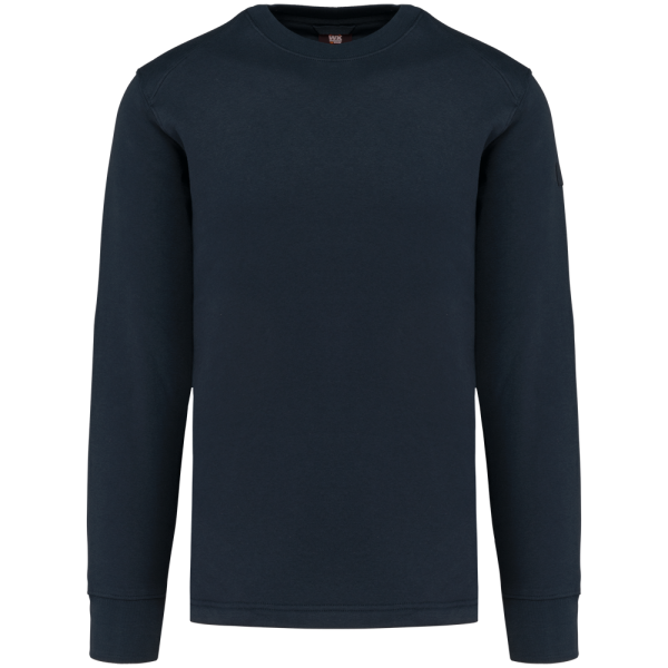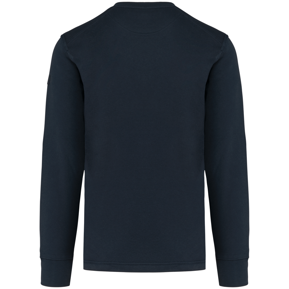 80% katoen / 20% polyester. Fleece 3 draden met LSF-behandeling (Low Shrinkage Fleece). Wasbaar op 60 °C. Ronde hals en mouwuiteinden in ribboord. Onzichtbare ritszak rechterzijkant. Versteviging op de schouders en ellebogen. Penhouder op de linkermouw. Halvemaanvormige afwerking op de achterkant. Ophanglus in de kraag. Afwerking met dubbel stiksel onderaan en verlengd achterpand voor meer comfort.