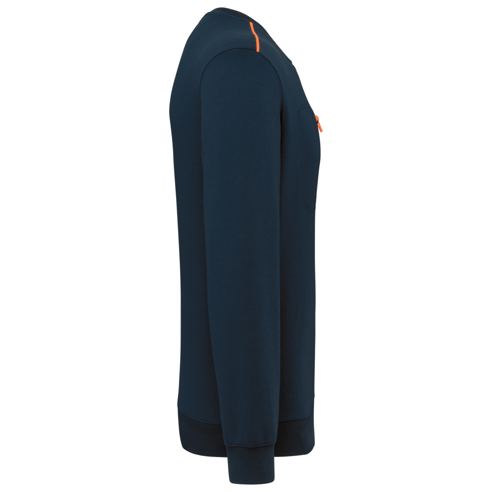 70% polyester / 30% katoen. Gekamd katoen. Aan de binnenkant geborsteld LSF-fleece (Low Shrinkage Fleece) met 3 draden. Vortex-garen. Wasbaar op 60 °C. Rechte snit. Ronde hals met 1x1 ribboord en ton-sur-ton nektape met contrasterende bies. Halvemaanvormige halsopening op de achterkant, voor eenvoudige personalisatie van het merk aan de binnenkant. Contrasterende bies op de schouders. Borstzakje aan de rechterkant, met een contrasterende rits van nylon en een contrasterende ritstrekker. Ton-sur-ton dubbel stiksel op de omtrek van de zak. Tear-away merklabel.