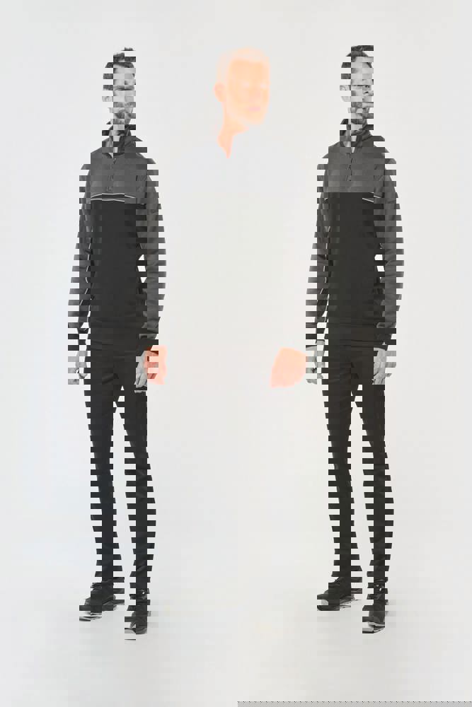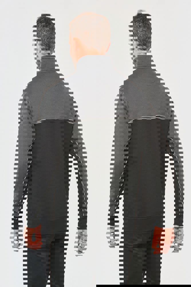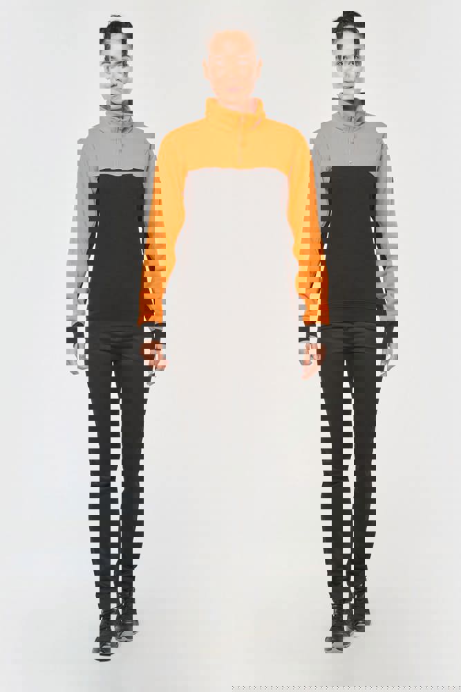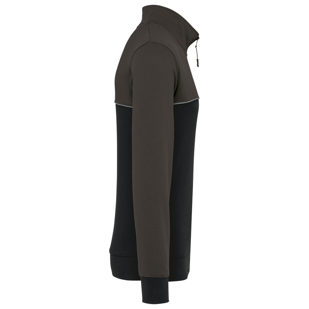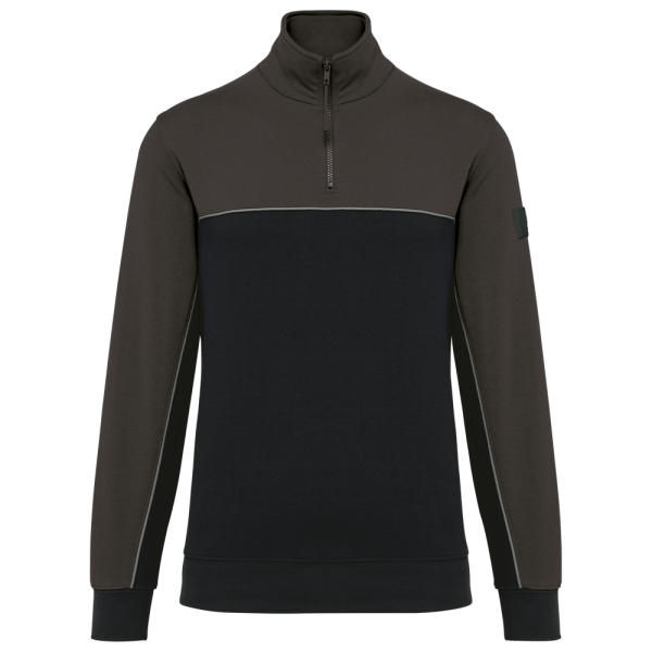 60% katoen / 40% gerecycleerd polyester. Aan de binnenkant geborsteld fleece 3 draden LSF (Low Shrinkage Fleece). Rechte snit. Ingezette mouwen. Kraag met plastic rits en gerecycleerde toon-op-toon ritstrekker. Contrasterende nektape met visgraatmotief. Halvemaanvormige halsopening op de achterkant, voor eenvoudige personalisatie van het merk aan de binnenkant. Contrasterende bies tussen de tweekleurige delen van het kledingstuk (lichaam, voorkant mouwen en rug). 1x1 ribboord aan mouwuiteinden en boord. Elastische penhouder met 3 vakken op de linkermouw. Tear-away merklabel.