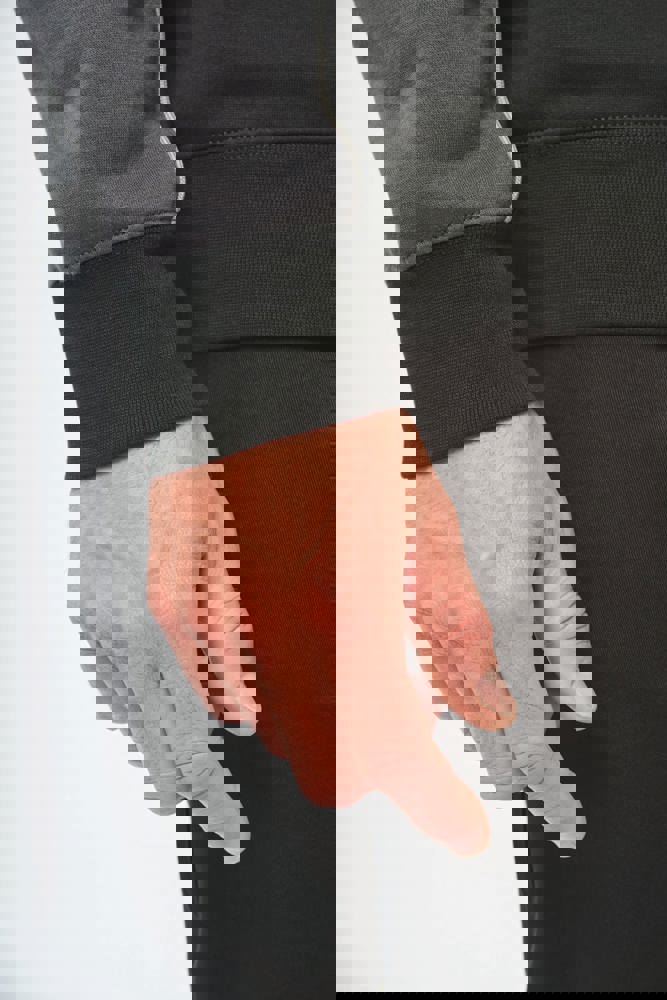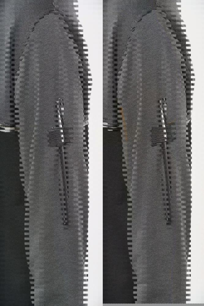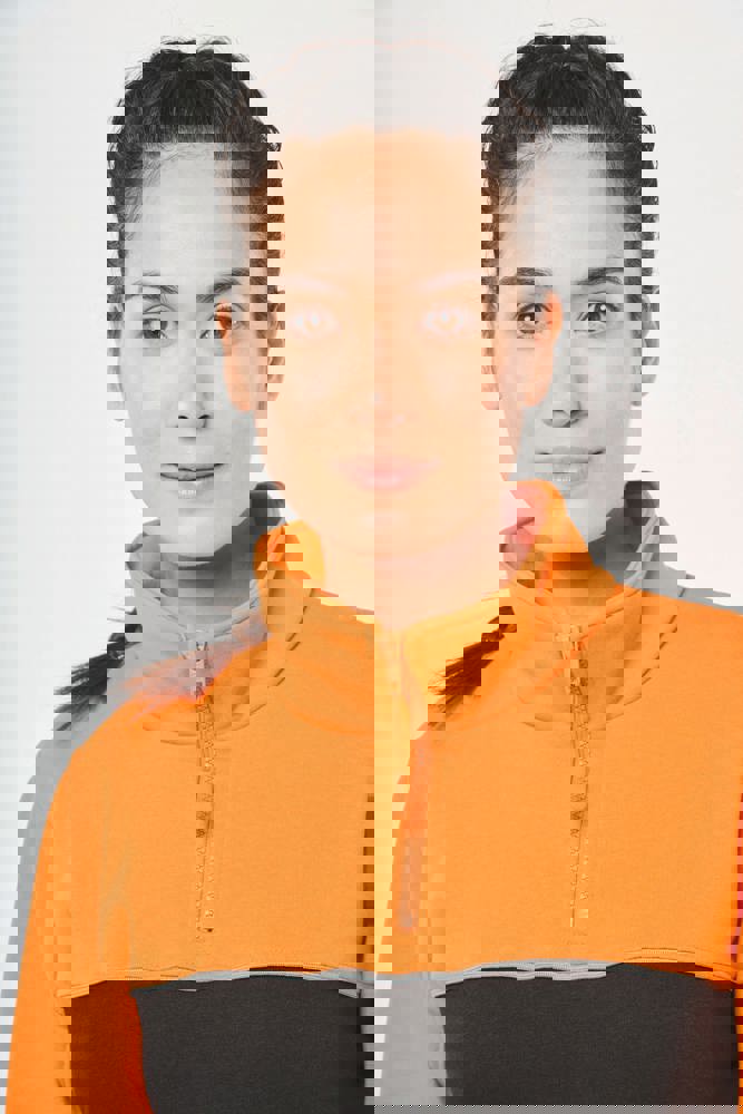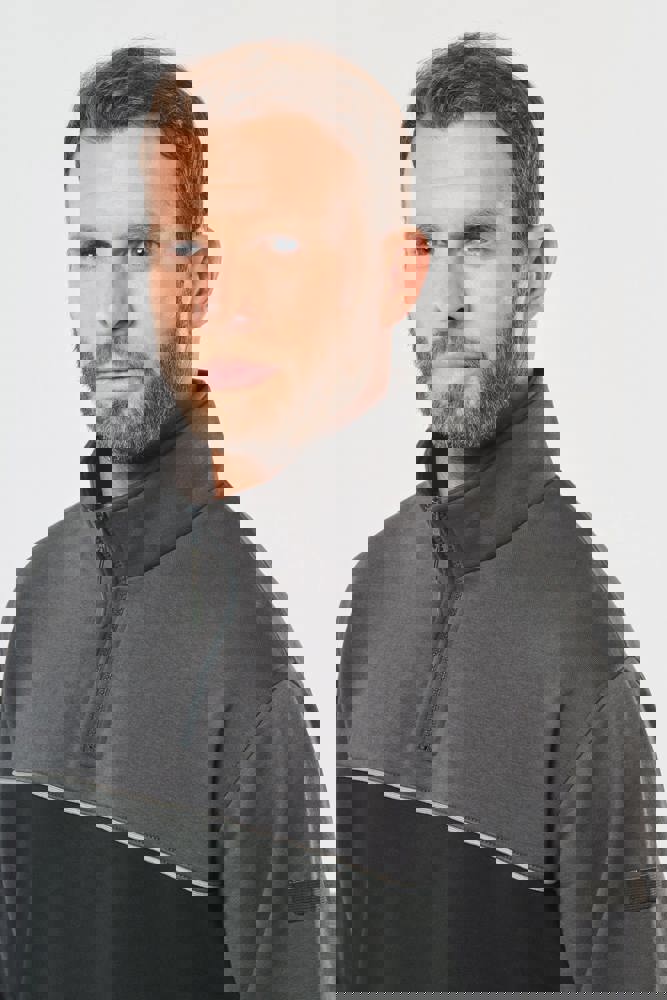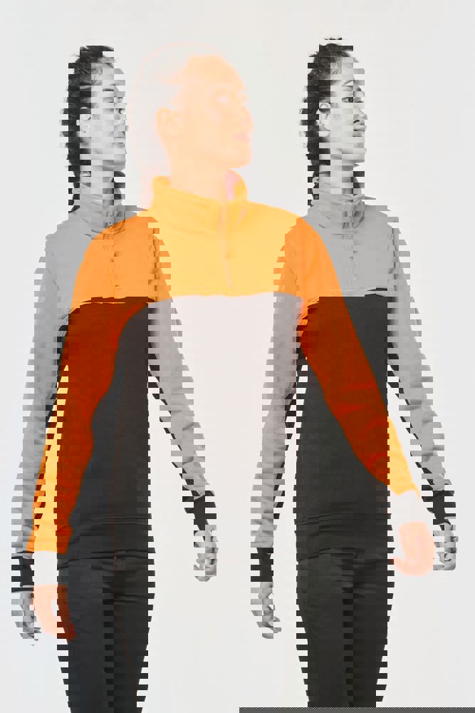 60% katoen / 40% gerecycleerd polyester. Aan de binnenkant geborsteld fleece 3 draden LSF (Low Shrinkage Fleece). Rechte snit. Ingezette mouwen. Kraag met plastic rits en gerecycleerde toon-op-toon ritstrekker. Contrasterende nektape met visgraatmotief. Halvemaanvormige halsopening op de achterkant, voor eenvoudige personalisatie van het merk aan de binnenkant. Contrasterende bies tussen de tweekleurige delen van het kledingstuk (lichaam, voorkant mouwen en rug). 1x1 ribboord aan mouwuiteinden en boord. Elastische penhouder met 3 vakken op de linkermouw. Tear-away merklabel.