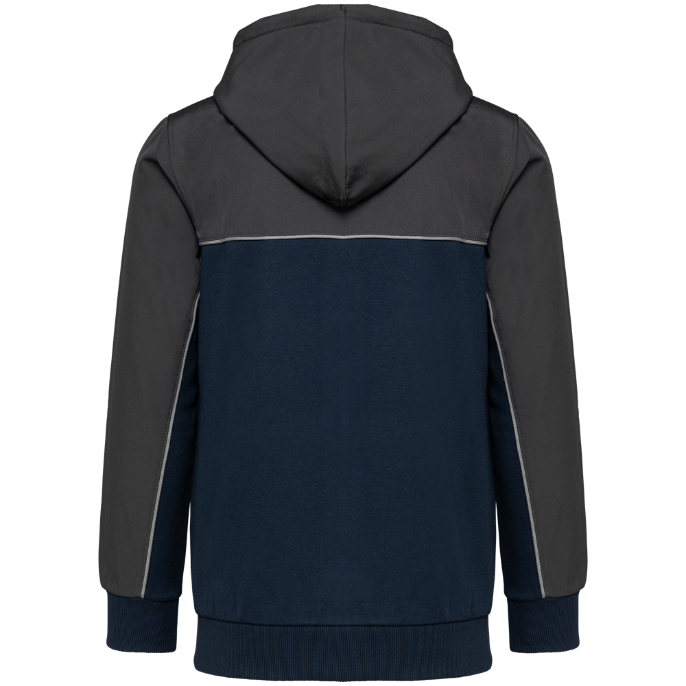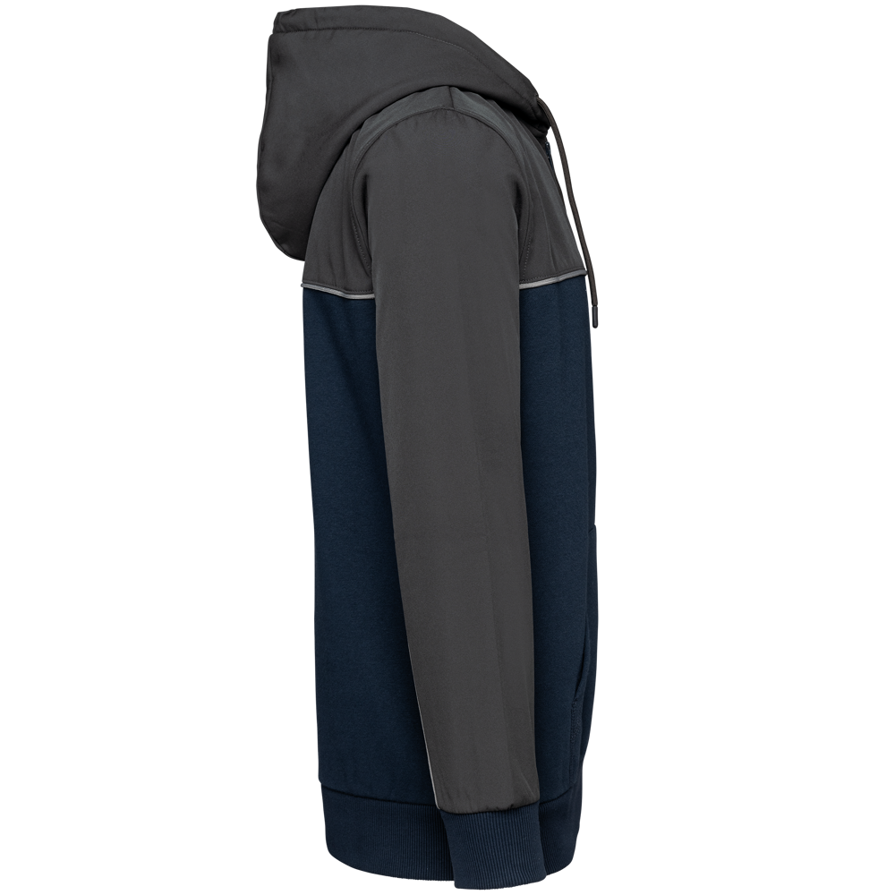 60% katoen / 40% gerecycleerd polyester. Stof van de inzetstukken: waterafstotende softshell 2 lagen 95% polyester / 5% elasthan. Rechte snit. 2 kangoeroezakken. Capuchon in 2 delen met rond aanrijgkoordje met rubberen uiteinden. Contrasterende inzetsels vooraan, achteraan en bovenaan de mouwen. Toon-op-toon ritssluiting aan de voorkant. Halvemaan in softshell op de rug. Contrasterende bies in Silver op de inzetsels vooraan en aan de mouwen. Ophanglus en nektape in kepermotief in Silver in de kraag. Mouwuiteinden en boord onderaan in 2x2 ribboord in buisconstructie. Afneembaar merklabel.
