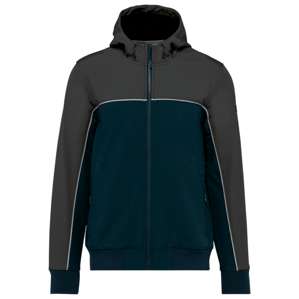 96% polyester / 4% elasthan. 3-laagse ademende stof 3000 g/m²/24 u en waterdicht 5000 mm. Buitenkant: 96% polyester / 4% elasthan. Tussenlaag: ademend en waterdicht membraan. Binnenlaag: microfleece. BIONIC FINISH ® ECO behandeling (waterdicht, zonder fluor voor optimale prestaties). Plastic ritssluiting met ton-sur-ton ritstrekker. 2 ritszakken met ritstrekker aan de voorkant. 3-delige, verstelbare capuchon met stoppers in de naad. Contrasterend nektape met ophanglint in de kraag. Elastische penhouder met 3 vakken op de linkermouw. Contrasterende bies tussen de tweekleurige delen van het kledingstuk (lichaam, voorkant mouwen en rug). Gevoerde 2x2 ribboord met elasthan aan de mouwuiteinden en de boord. Tear-away merklabel.