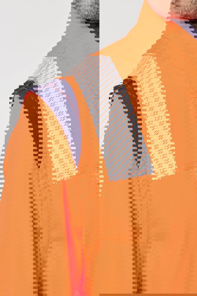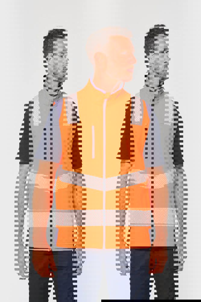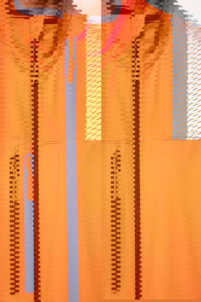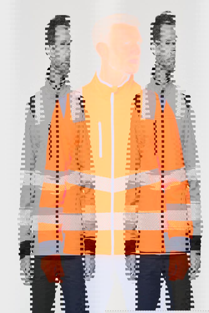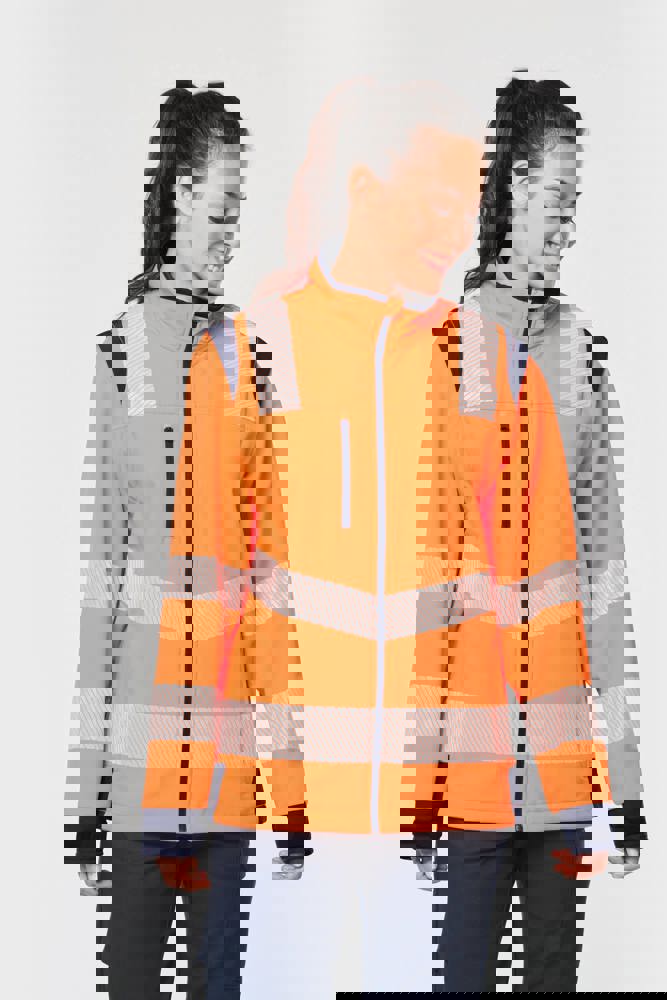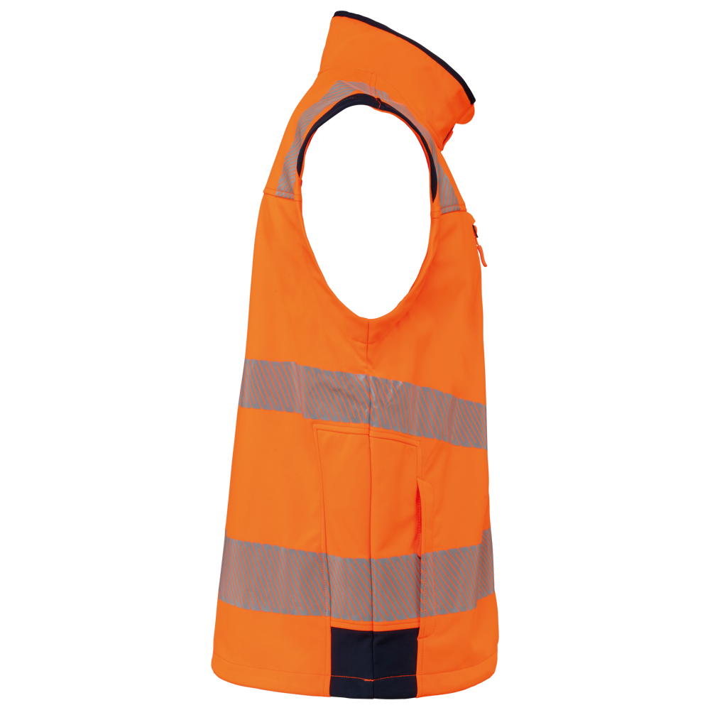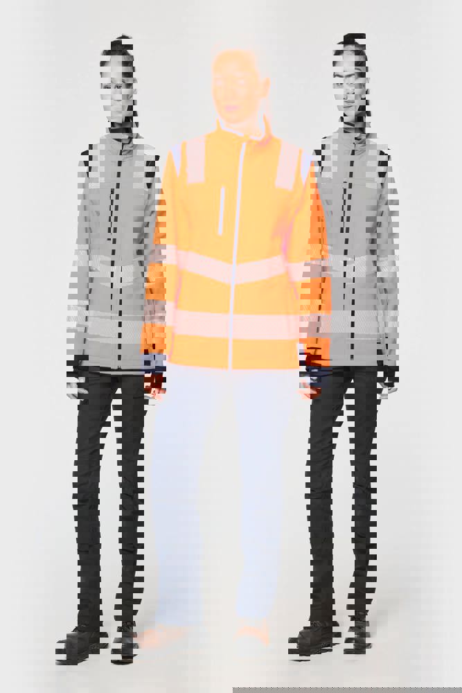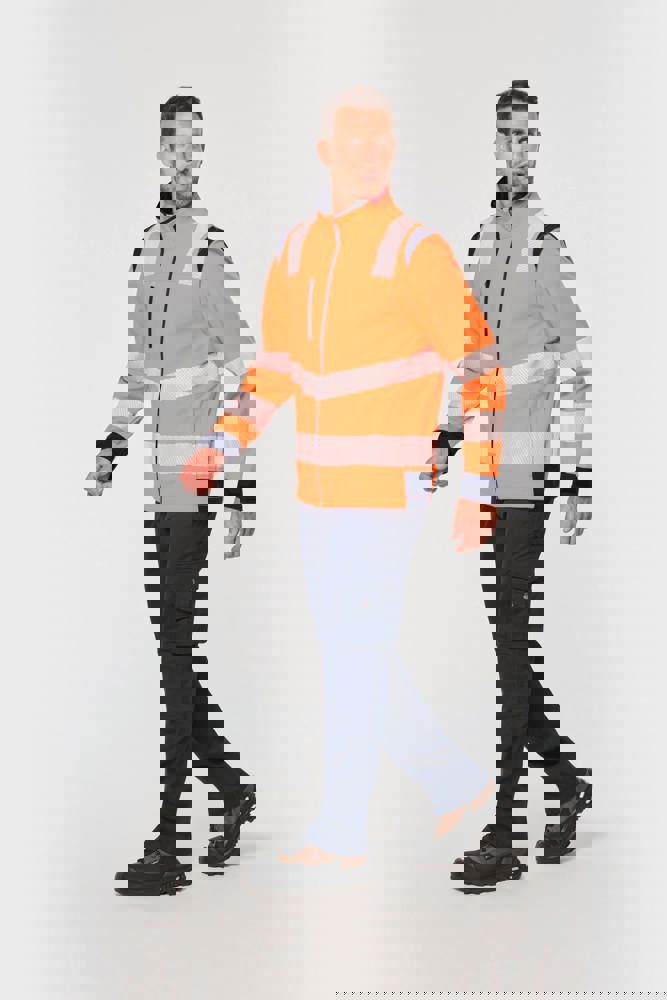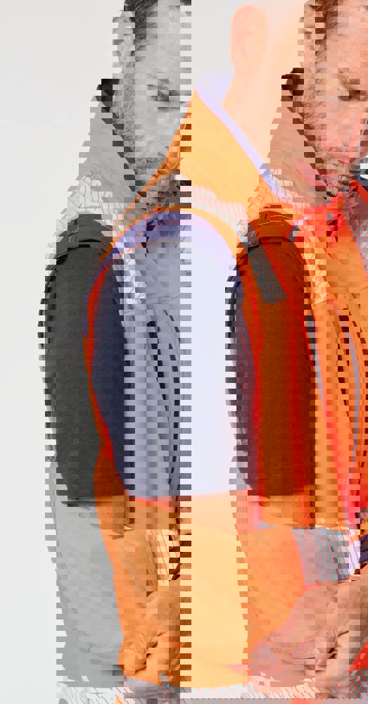 94% gerecycled polyester / 6% elastaan. 3-laags ademend gelamineerd materiaal met een waterdampdoorlaatbaarheid van 3000g/m²/24u en een waterdichtheid van 5000mm. Buitenkant: 94% gerecycled polyester / 6% elastaan. Tussenlaag: ademende en waterdichte membraan. Binnenlaag: 100% gerecycled polyester microfleece. Wasbaar op 40°C (25 wasbeurten). Nylon rits met kinbescherming en ritstrekkertje. 1 verticale borstzak met rits aan de rechterkant. 2 zijzakken met rits. 2 binnenzakken. Verstelbare manchetten met klittenband. Afneembare mouwen met rits. Onderaan verstelbaar met een trekkoord. Contrasterende inzetstukken op schouders, manchetten en zijkanten. Contrasterende binnenkant kraag en nekband. Ophanglus aan de binnenkant van de kraag. 5,5 cm gesegmenteerde reflecterende biezen op schouders, onder borst en mouwen. 7 cm retro-reflecterende gesegmenteerde banden op onderlichaam en mouwen. PBM Klasse II. Normen NF EN ISO 13688:2013 + NF EN ISO 13688/A1:2021 (Algemene eisen voor beschermende kleding), NF EN ISO 20471:2013 + NF EN ISO 20471/A1:2017: Kleding met mouwen: Klasse 2 voor maat XS en S - Klasse 3 voor maat M tot 6XL, Kleding zonder mouwen: Klasse 1 voor maat XS en S - Klasse 2 voor maat M tot 6XL (Hoogzichtbare kleding - Testmethoden en eisen), RIS-3279-TOM Issue 2:2019 alleen voor de kleur Hi Viz Orange/Navy (Norm voor de spoorwegindustrie). Afneembaar merketiket.