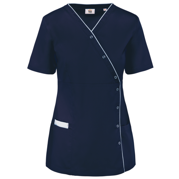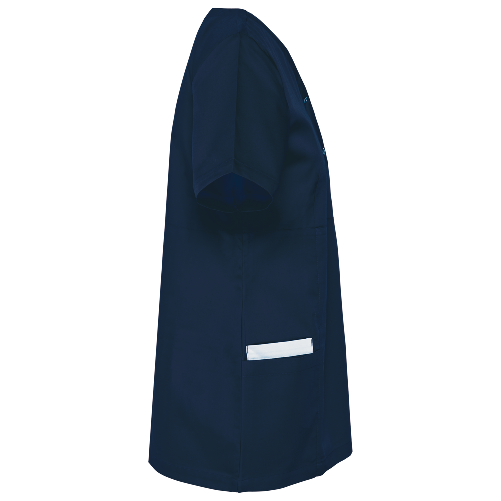 65% polyester / 35% katoen. Polykatoenen twill-stof. Wassen op 60°C. Vrouwelijke, rechte snit dankzij plooien aan de voor- en achterkant. V-hals, asymmetrische sluiting met drukknoopjes. 2 zakken vooraan, waarvan één (rechts) met twee vakjes (binnenzak met contrasterende boord). Contrasterende bies aan de halsopening en langs de knoopsluiting. Naamlabel aan de binnenkant. Tear-away merklabel.