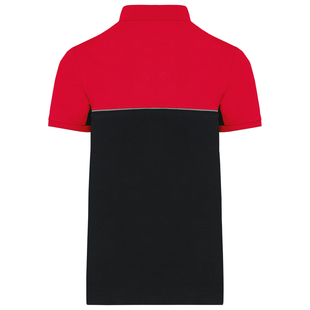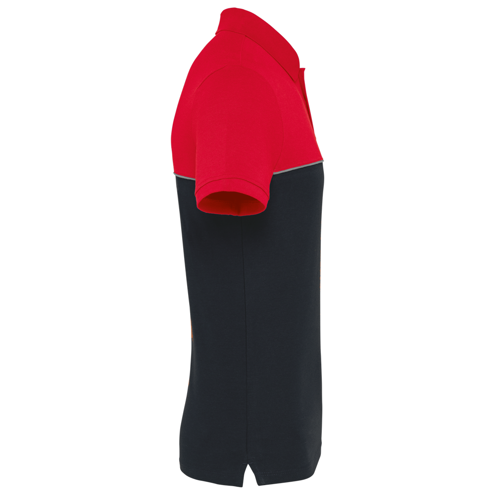 60% katoen / 40% polyester. Gemaakt van 60% gekamd katoen en 40% gerecycleerd polyester. Vortex-garen. Piquétricot. Anti-pluisbehandeling. Wasbaar op 60 °C. Rechte snit. Toon-op-toon lijst met 2 knopen. Kraag in 1x1 ribboord met contrasterende nektape met visgraatmotief.Contrasterende bies tussen de tweekleurige delen van het kledingstuk (lichaam, voorkant mouwen en rug). Afgewerkt met ribboord aan de mouwuiteinden. Zijsplitten met contrasterend visgraatmotief. Afwerking met dubbel stiksel onderaan. Tear-away merklabel.