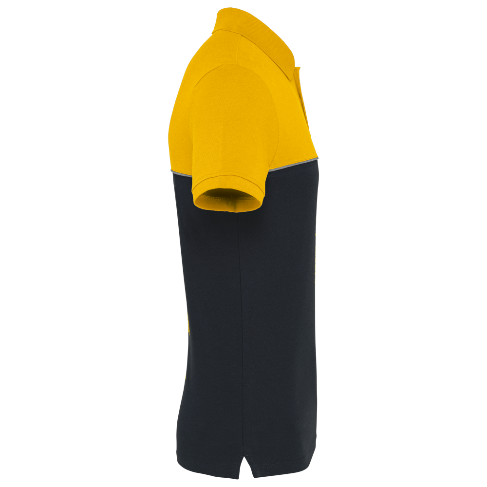 60% katoen / 40% polyester. Gemaakt van 60% gekamd katoen en 40% gerecycleerd polyester. Vortex-garen. Piquétricot. Anti-pluisbehandeling. Wasbaar op 60 °C. Rechte snit. Toon-op-toon lijst met 2 knopen. Kraag in 1x1 ribboord met contrasterende nektape met visgraatmotief.Contrasterende bies tussen de tweekleurige delen van het kledingstuk (lichaam, voorkant mouwen en rug). Afgewerkt met ribboord aan de mouwuiteinden. Zijsplitten met contrasterend visgraatmotief. Afwerking met dubbel stiksel onderaan. Tear-away merklabel.