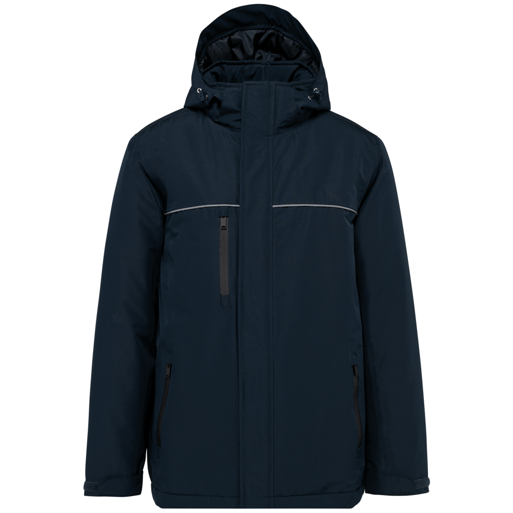 100% polyester. 2-laags ripstop gelamineerde stof met ademend TPU-membraan 3000 g/m²/24u. Waterdichte behandeling en volledig getapete naden. Wasbaar op 40°C. Bovenlichaam gevoerd met fleece. Onderkant van het kledingstuk en mouwen gevoerd met gewatteerd 300T polyester. Vulling: 100% polyester. Ritssluiting met kinbescherming verborgen onder een stormflap met klittenbandsluiting. 2 zijzakken en 1 borstzak met waterdichte ritsen. Contrasterende paspel op borsthoogte. Manchetten verstelbaar met klittenband. Afneembare en gevoerde capuchon verstelbaar met elastische trekkoorden en koordstoppers. 1 binnenzak met klittenbandsluiting aan de rechterkant van de borst. 2 binnenritsen voor personalisatie: 1 op de linkerborst en 1 onderaan de rug. Ophanglus aan de binnenkant van de bovenrug. Verstelbare zoom met elastische trekkoorden en stoppers. PBM Categorie I. Ontworpen volgens EN ISO 13688:2013+A1:2021 “Beschermende kleding - Algemene vereisten” en voldoet aan EN 343:2019 “Beschermende kleding - Bescherming tegen regen”: Klasse 3 / Klasse 1 / X. Afneembaar merklabel.