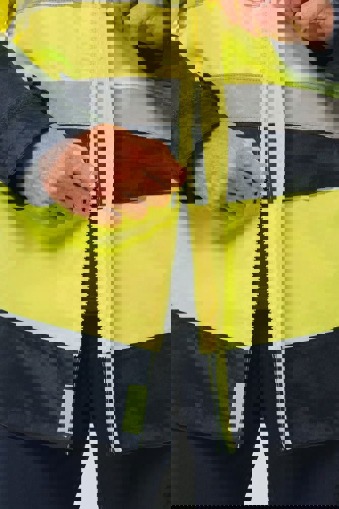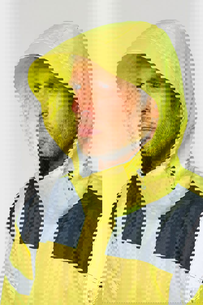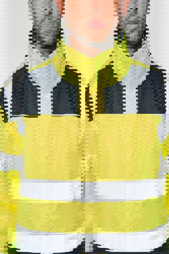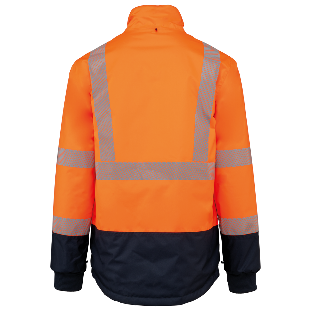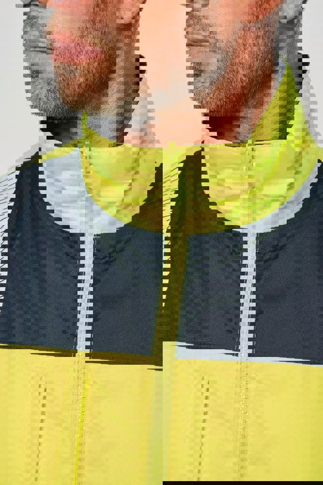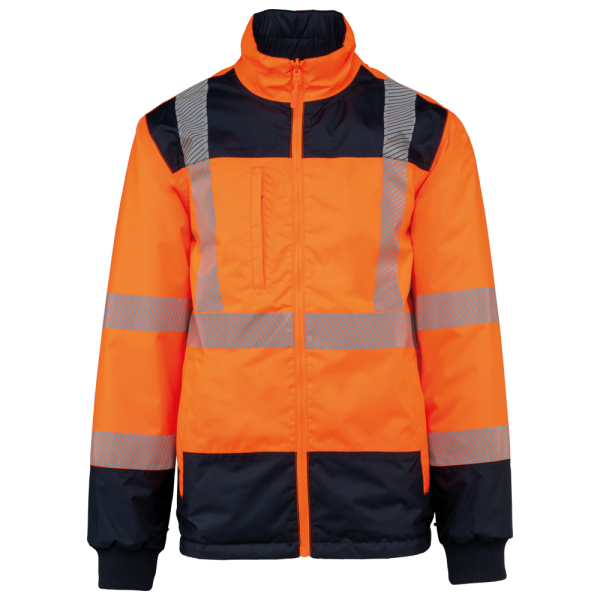 100% gerecycled polyester. Oxford stof met PU-coating. Waterdichte behandeling en thermisch gelaste naden. Wasbaar op 40°C. Dubbel-rits sluiting met een verborgen ritstrekkertje onder een flap die met klittenband is afgesloten. Binnenvoering van lichaam en mouwen in 100% polyester mesh. 2 verticale zijzakken met rits + 2 horizontale zakken met kleppen die met klittenband zijn afgesloten. 1 verborgen borstzak met rits onder de flap aan de linkerkant. Verstelbare manchetten met klittenband. Contrastvoering van 100% polyester fleece aan de binnenkant van de kraag met ophanglus. Afneembare capuchon met rits, gevoerd met mesh en verstelbaar met elastische trekkoorden en klittenband. Opbergzak voor de capuchon verborgen in de kraag, afgesloten met klittenband. Contrastpanelen op schouders, onderkant van de mouwen, onderkant van het kledingstuk en zakflappen. Segmentbanden met retroreflectie van 5 cm op schouders, borst, lichaam en mouwen, voor en achter. 1 borst rits + 1 zak met klittenband aan de binnenkant aan de linkerkant. 1 onzichtbare personalisatie rits aan de onderkant van het kledingstuk. Onderaan verstelbaar met elastische trekkoorden. Omkeerbare binnenjas: 100% gerecycled polyester. Oxford stof met PU-coating. Waterdichte behandeling en thermisch gelaste naden. Wasbaar op 40°C (25 wasbeurten). Rits sluiting met omkeerbare slider en ritstrekkertje. 2 verticale zijzakken met rits. 1 borstzak met rits aan de rechterkant. 2x2 ribgebreide afwerking aan de onderkant van de mouwen. Contrastpanelen aan de bovenkant van het lichaam, onderkant van de mouwen en onderkant van het kledingstuk, voor en achter. Segmentbanden met retroreflectie van 5 cm op lichaam en mouwen, voor en achter. Omkeerbare kant: 100% polyamide. Taffeta stof met PA-coating en padding. 2 verticale zijzakken met rits. Ophanglus aan de binnenkant van de kraag. 1 onzichtbare personalisatie rits aan de onderkant van het kledingstuk, verborgen in een naad. De kledingstukken zijn met elkaar verbonden door een rits systeem aan de voorkant en knopen met ophanglussen in de kraag en de mouwen. PBM Klasse II. Normen NF EN ISO 13688:2013 + NF EN ISO 13688/A1:2021 (Beschermende kleding - Algemene eisen), NF EN ISO 20471:2013 + NF EN ISO 20471/A1:2017: Buitenschaal - Klasse 3, Binnenjas - Klasse 2 (Hoogzichtbare kleding - Testmethoden en eisen), NF EN 343:2019: Klasse 3: 3 alleen voor de buitenjas (Beschermende kleding - Bescherming tegen regen), RIS-3279-TOM Issue 2:2019 alleen voor de kleur Hi Viz Orange/Navy (Norm voor de spoorwegindustrie). Afneembaar merketiket.