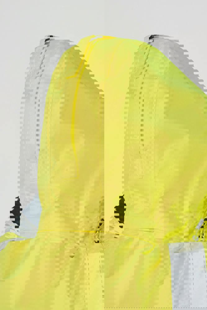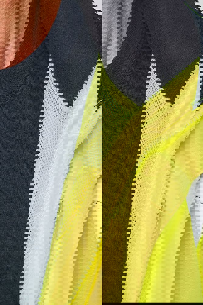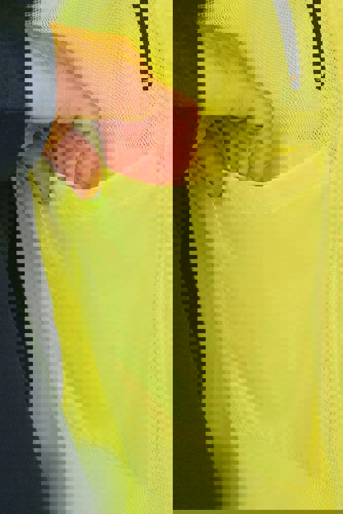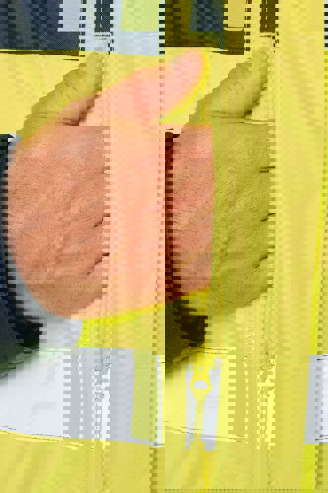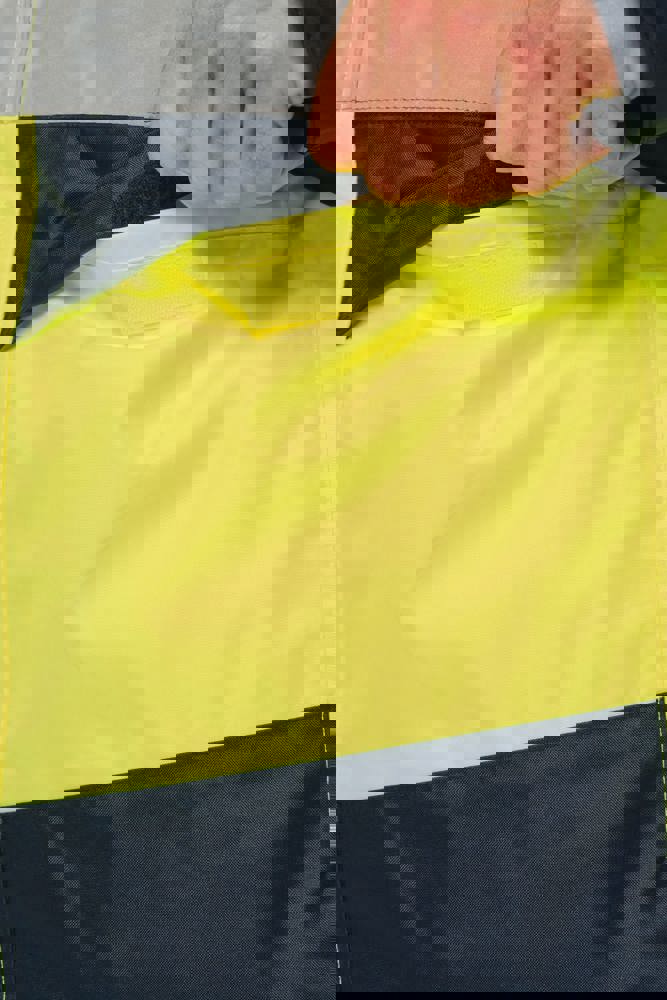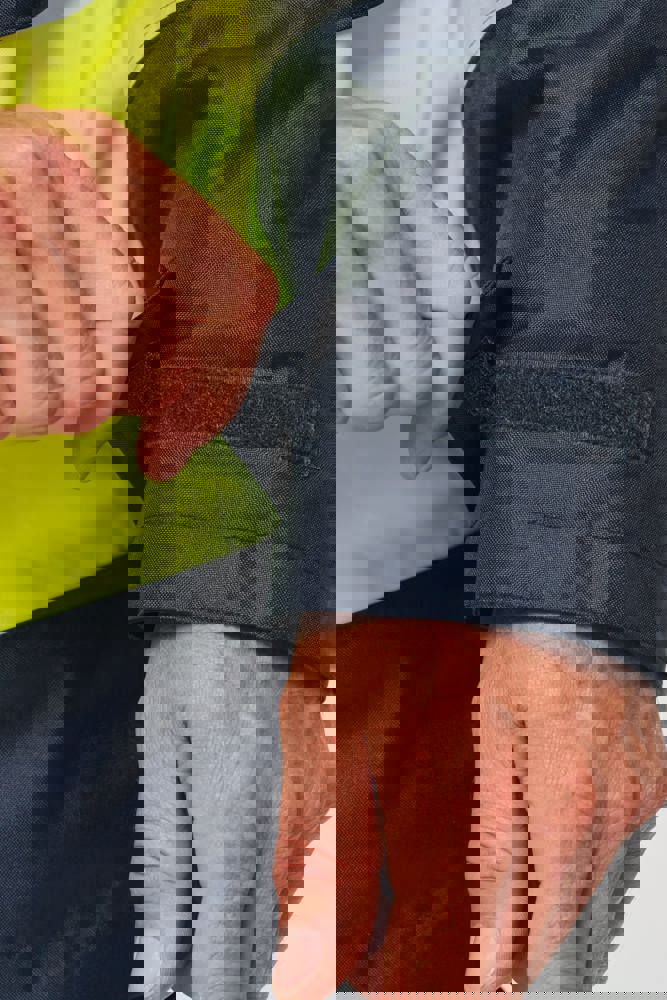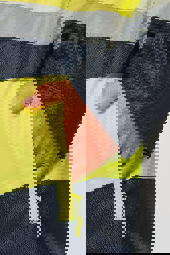 100% gerecycled polyester. Oxford stof met PU-coating. Waterdichte behandeling en thermisch gelaste naden. Wasbaar op 40°C. Dubbel-rits sluiting met een verborgen ritstrekkertje onder een flap die met klittenband is afgesloten. Binnenvoering van lichaam en mouwen in 100% polyester mesh. 2 verticale zijzakken met rits + 2 horizontale zakken met kleppen die met klittenband zijn afgesloten. 1 verborgen borstzak met rits onder de flap aan de linkerkant. Verstelbare manchetten met klittenband. Contrastvoering van 100% polyester fleece aan de binnenkant van de kraag met ophanglus. Afneembare capuchon met rits, gevoerd met mesh en verstelbaar met elastische trekkoorden en klittenband. Opbergzak voor de capuchon verborgen in de kraag, afgesloten met klittenband. Contrastpanelen op schouders, onderkant van de mouwen, onderkant van het kledingstuk en zakflappen. Segmentbanden met retroreflectie van 5 cm op schouders, borst, lichaam en mouwen, voor en achter. 1 borst rits + 1 zak met klittenband aan de binnenkant aan de linkerkant. 1 onzichtbare personalisatie rits aan de onderkant van het kledingstuk. Onderaan verstelbaar met elastische trekkoorden. Omkeerbare binnenjas: 100% gerecycled polyester. Oxford stof met PU-coating. Waterdichte behandeling en thermisch gelaste naden. Wasbaar op 40°C (25 wasbeurten). Rits sluiting met omkeerbare slider en ritstrekkertje. 2 verticale zijzakken met rits. 1 borstzak met rits aan de rechterkant. 2x2 ribgebreide afwerking aan de onderkant van de mouwen. Contrastpanelen aan de bovenkant van het lichaam, onderkant van de mouwen en onderkant van het kledingstuk, voor en achter. Segmentbanden met retroreflectie van 5 cm op lichaam en mouwen, voor en achter. Omkeerbare kant: 100% polyamide. Taffeta stof met PA-coating en padding. 2 verticale zijzakken met rits. Ophanglus aan de binnenkant van de kraag. 1 onzichtbare personalisatie rits aan de onderkant van het kledingstuk, verborgen in een naad. De kledingstukken zijn met elkaar verbonden door een rits systeem aan de voorkant en knopen met ophanglussen in de kraag en de mouwen. PBM Klasse II. Normen NF EN ISO 13688:2013 + NF EN ISO 13688/A1:2021 (Beschermende kleding - Algemene eisen), NF EN ISO 20471:2013 + NF EN ISO 20471/A1:2017: Buitenschaal - Klasse 3, Binnenjas - Klasse 2 (Hoogzichtbare kleding - Testmethoden en eisen), NF EN 343:2019: Klasse 3: 3 alleen voor de buitenjas (Beschermende kleding - Bescherming tegen regen), RIS-3279-TOM Issue 2:2019 alleen voor de kleur Hi Viz Orange/Navy (Norm voor de spoorwegindustrie). Afneembaar merketiket.