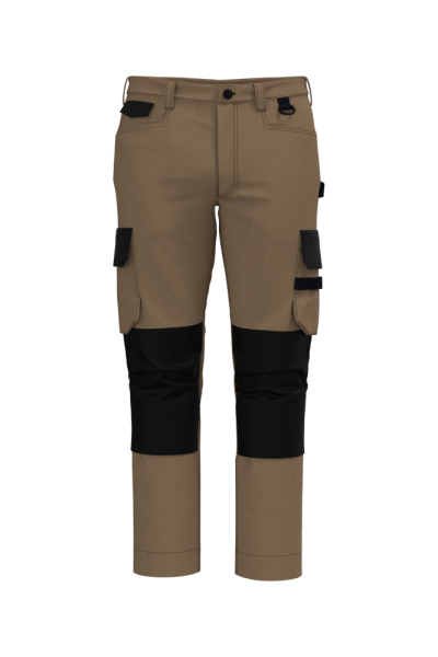 65% polyester / 35% katoen. Wasbaar op 60 °C. Rechte snit. 2 zakken aan de voorkant (binnenzakken in de hoofdstof), waarvan 1 met een binnenzakje dat sluit met een contrasterende klep (behalve voor de kleur zwart). 2 losse cargozakken met ruimteplooi en contrasterende klep (behalve voor de kleur zwart) met klittenbandsluiting, waarvan één met 2 vakken en plaats voor gereedschap. 2 achterzakken met klep en klittenbandsluiting, 1 hamerlus links (bij het dragen). 2 contrasterende kniebeschermerzakken in Cordura® (in het zwart voor alle kleuren) met klittenbandsluiting en klep binnenin om de kniebeschermers op hun plaats te houden en aan te passen. Tailleband met lussen. Op de tailleband zit aan de voorkant links (bij het dragen) een plastic ring. Ritssluiting met knoop (metalen knoop bekleed met plastic). Dubbel stiksel in de zijnaden, drievoudig stiksel in het kruis voor- en achteraan. Kniebeschermers niet inbegrepen. Biesstiksel tussen de benen. Tussenbeenlengte van 80 cm en zoom van 5 cm. Afneembaar merklabel.