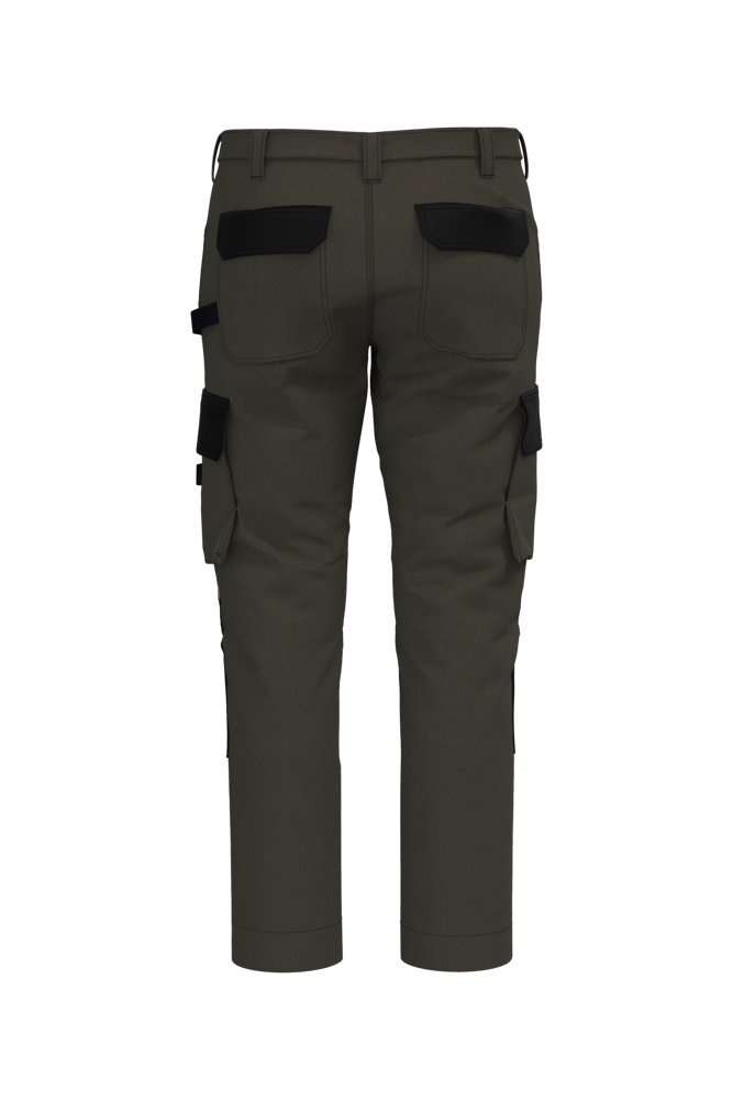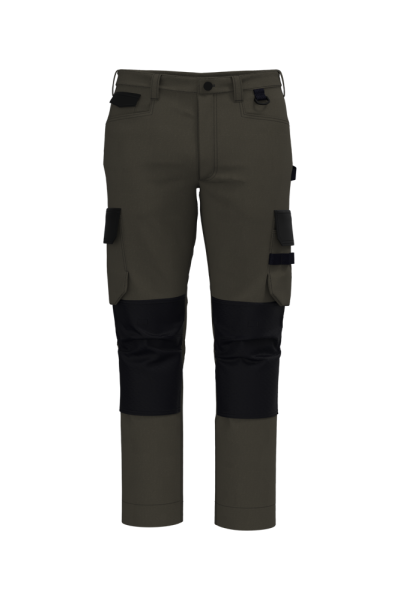 65% polyester / 35% katoen. Wasbaar op 60 °C. Rechte snit. 2 zakken aan de voorkant (binnenzakken in de hoofdstof), waarvan 1 met een binnenzakje dat sluit met een contrasterende klep (behalve voor de kleur zwart). 2 losse cargozakken met ruimteplooi en contrasterende klep (behalve voor de kleur zwart) met klittenbandsluiting, waarvan één met 2 vakken en plaats voor gereedschap. 2 achterzakken met klep en klittenbandsluiting, 1 hamerlus links (bij het dragen). 2 contrasterende kniebeschermerzakken in Cordura® (in het zwart voor alle kleuren) met klittenbandsluiting en klep binnenin om de kniebeschermers op hun plaats te houden en aan te passen. Tailleband met lussen. Op de tailleband zit aan de voorkant links (bij het dragen) een plastic ring. Ritssluiting met knoop (metalen knoop bekleed met plastic). Dubbel stiksel in de zijnaden, drievoudig stiksel in het kruis voor- en achteraan. Kniebeschermers niet inbegrepen. Biesstiksel tussen de benen. Tussenbeenlengte van 80 cm en zoom van 5 cm. Afneembaar merklabel.