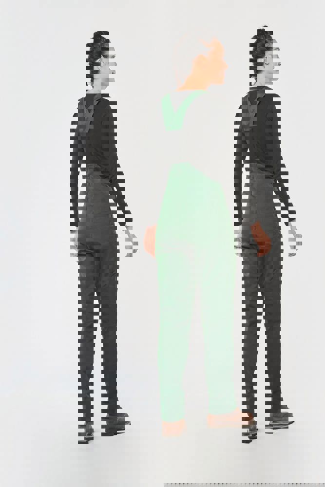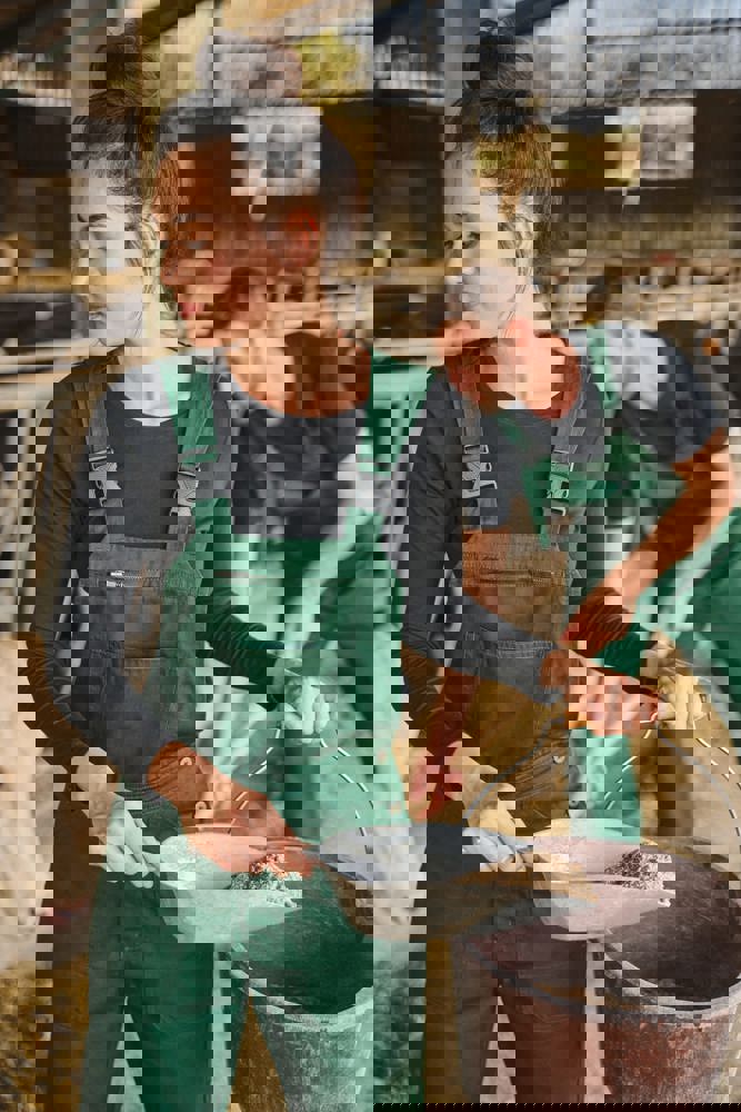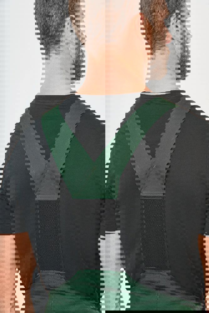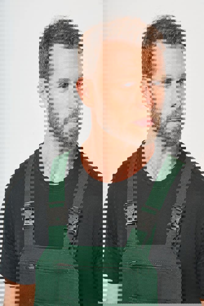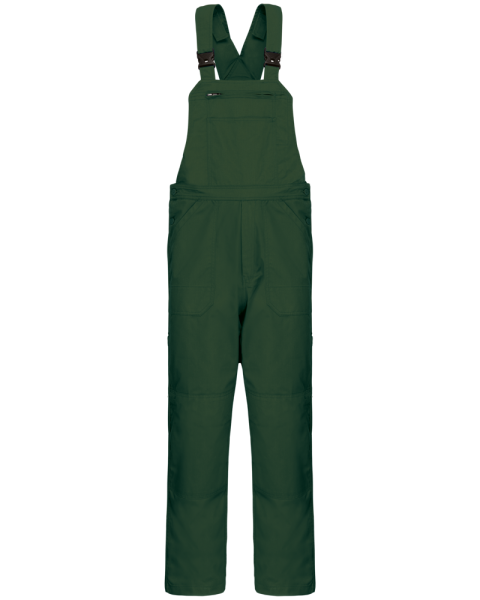 65% polyester / 35% katoen. Twillstof. Wasbaar op 60 °C. 5 zakken op de voorkant: 2 opgezette zakken + 1 grote ritszak in het midden op de voorkant, met 1 penzak. 1 opgezette achterzak. Regelbare schouderbanden met een plastic gesp. Een brede elastiek op de achterkant, voor meer bewegingsvrijheid. Gulp met ritssluiting. Opening aan de zijkant met een dubbele knooplijst. 1 naametiket aan de binnenkant. Versterkte naden + knieversteviging. Ophanglus.