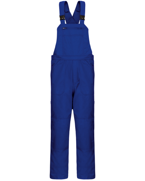 65% polyester / 35% katoen. Twillstof. Wasbaar op 60 °C. 5 zakken op de voorkant: 2 opgezette zakken + 1 grote ritszak in het midden op de voorkant, met 1 penzak. 1 opgezette achterzak. Regelbare schouderbanden met een plastic gesp. Een brede elastiek op de achterkant, voor meer bewegingsvrijheid. Gulp met ritssluiting. Opening aan de zijkant met een dubbele knooplijst. 1 naametiket aan de binnenkant. Versterkte naden + knieversteviging. Ophanglus.